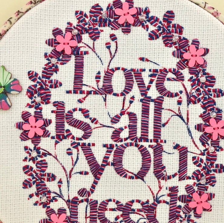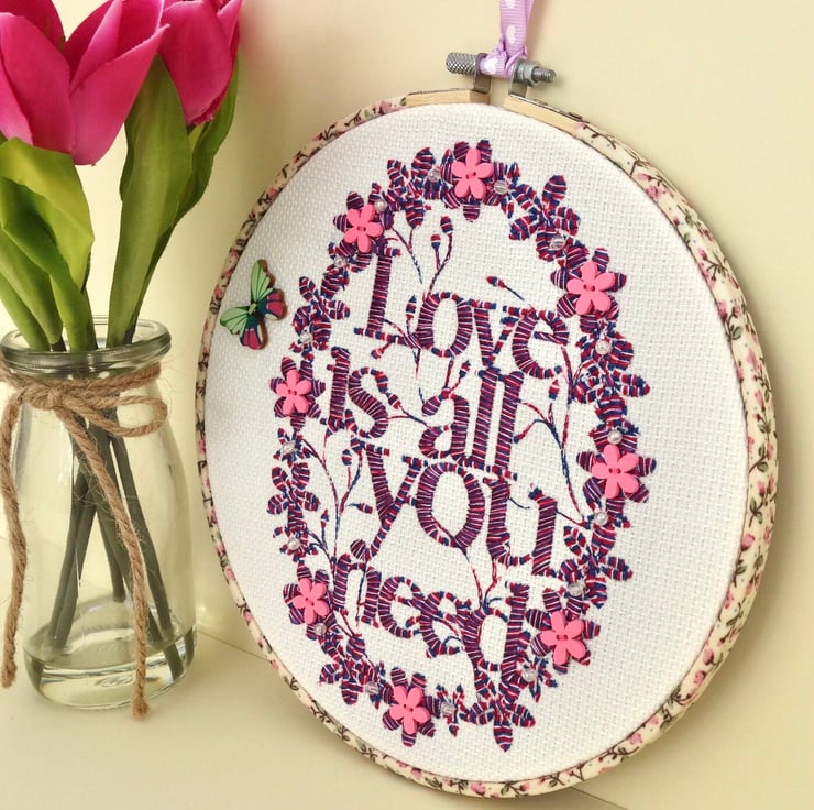 A machine Embroidered Hoop Wall Hanging, with a floral border and the words: Love is all you need, in Purple variegated thread. Decorated with Pink wooden button flowers and butterfly.