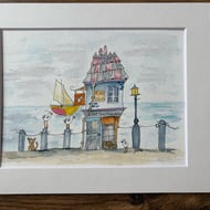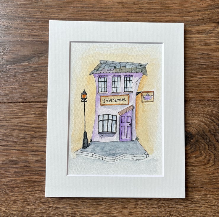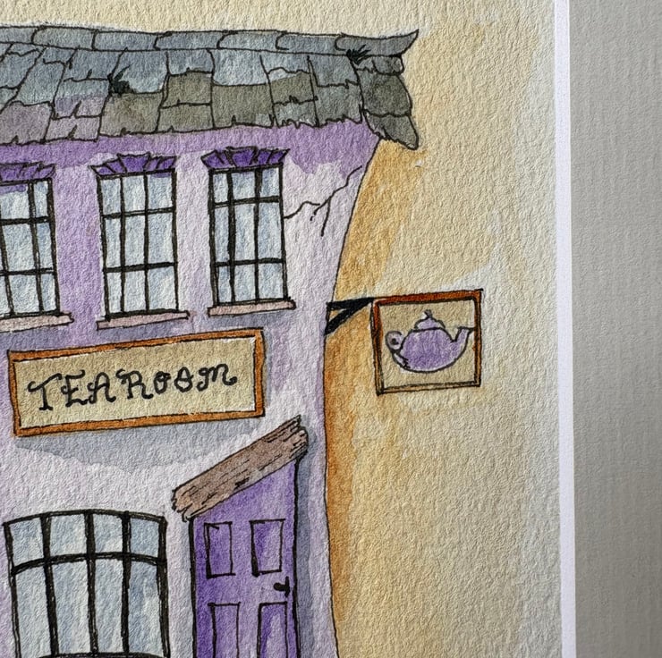 A cosy little tearoom brought to life in soft watercolours and fine ink lines. With its crooked roof, purple door, and swinging teapot sign, this charming scene feels straight out of a storybook.