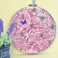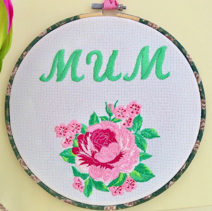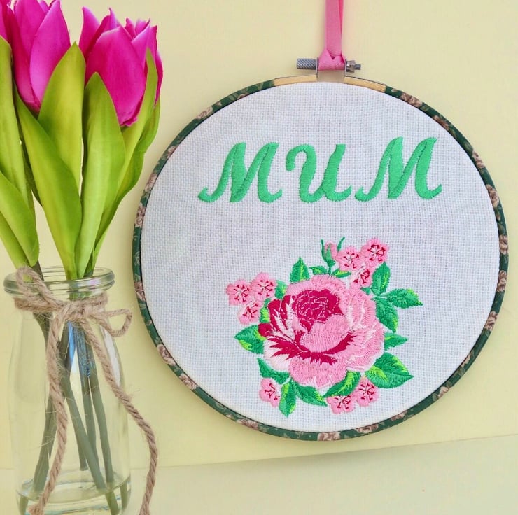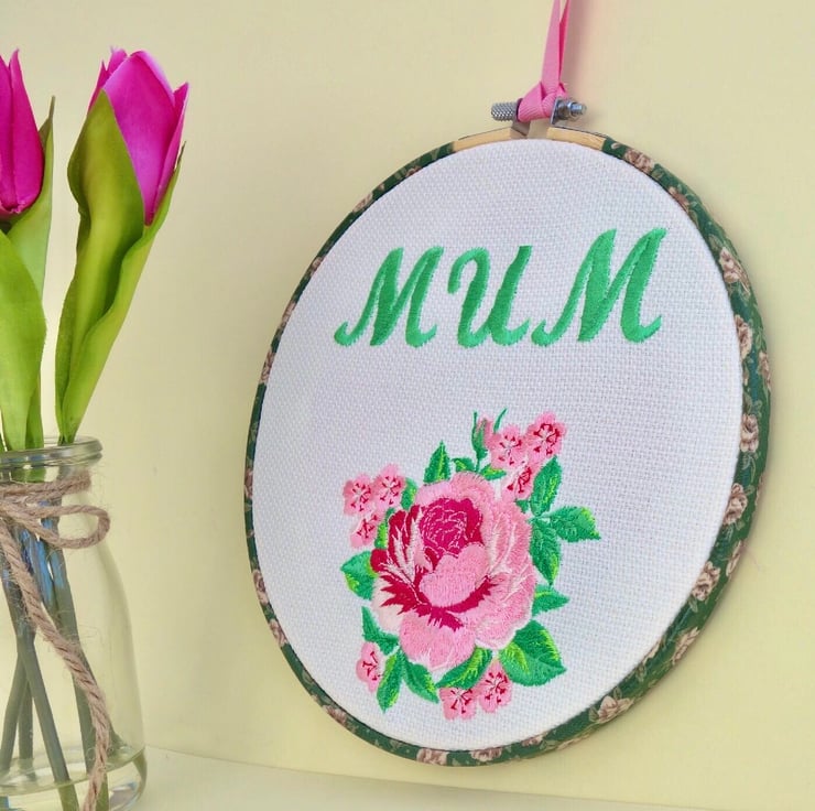 A machine Embroidered Hoop Wall Hanging, with the word Mum in Green thread, and a shades of Pink Rose with Green foliage, on a Light Cream fabric background.