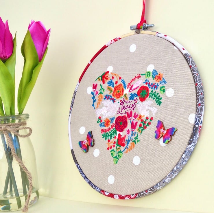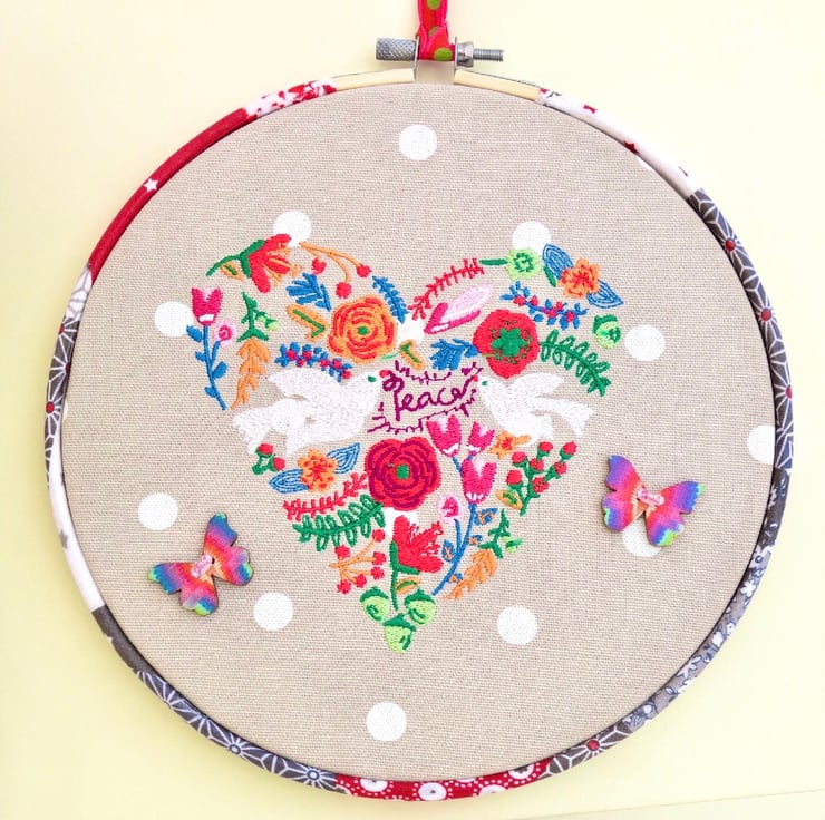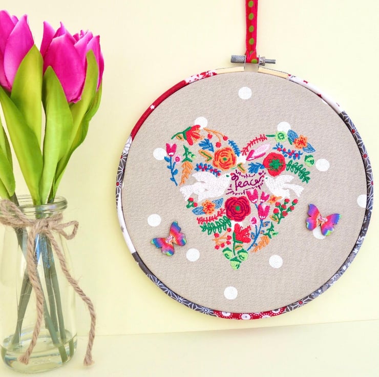 A machine Embroidered Hoop Wall Hanging, with a floral heart, with White doves and the word Peace in the centre. Decorated with wooden button butterflies. On a Beige spot fabric background.