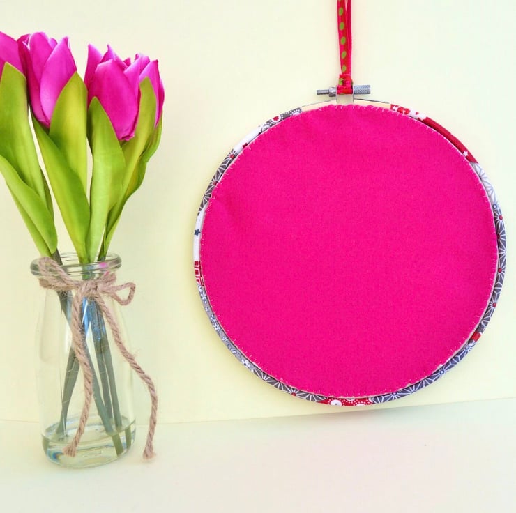 Fabric covered bamboo hoop frame, Ribbon hanging loop