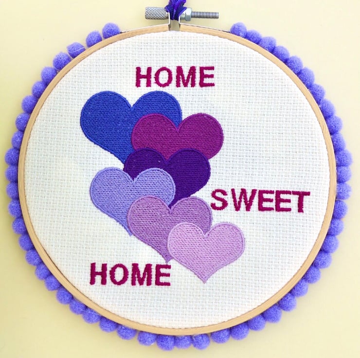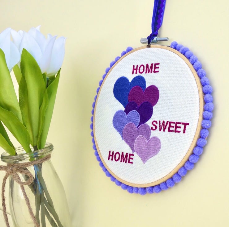 A machine Embroidered Hoop Wall Hanging, with shades of Purple overlapping hearts, and the words: Home Sweet Home in Purple thread, on a Light Cream background. Decorated with Purple PomPom trim.