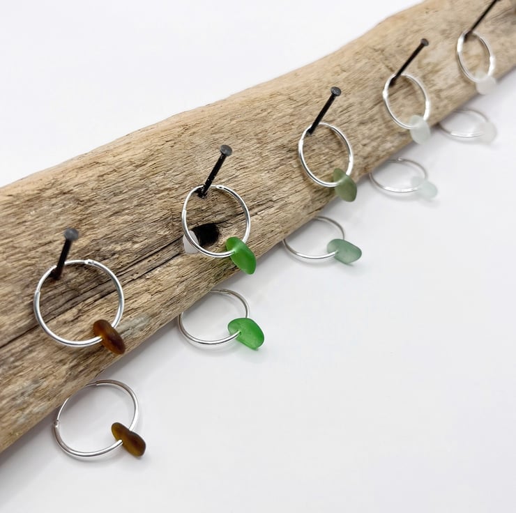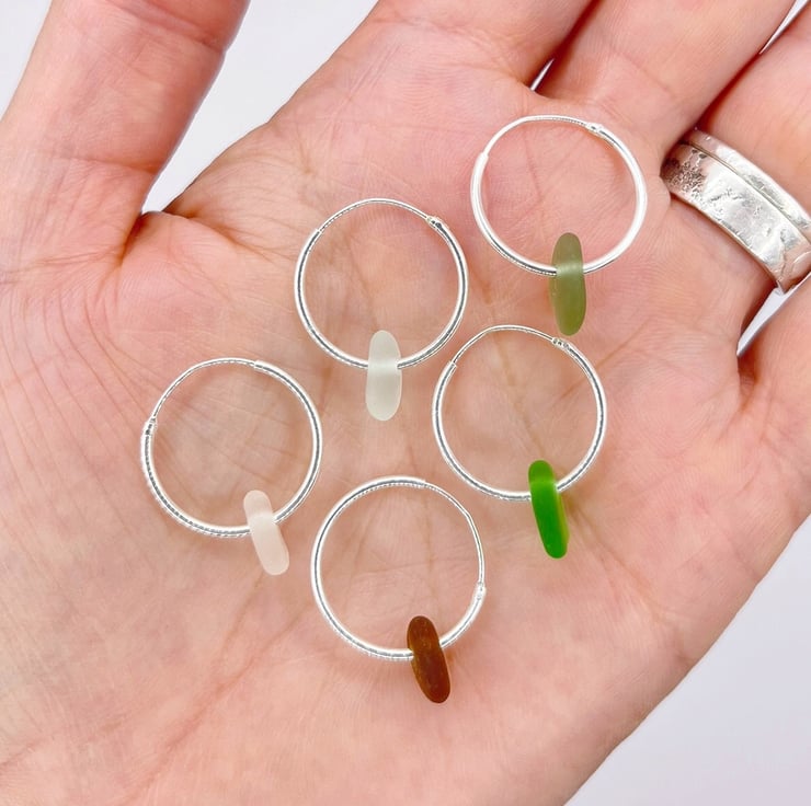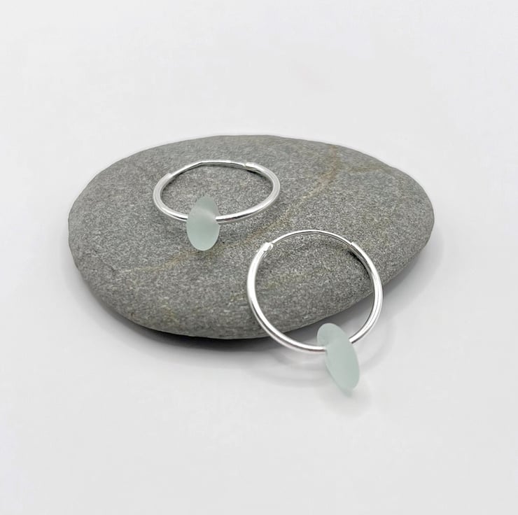 Cornish sea glass on hinged sterling silver hoop earrings in a choice of either 18mm or 30mm. The hoops used in the photos are 18mm.