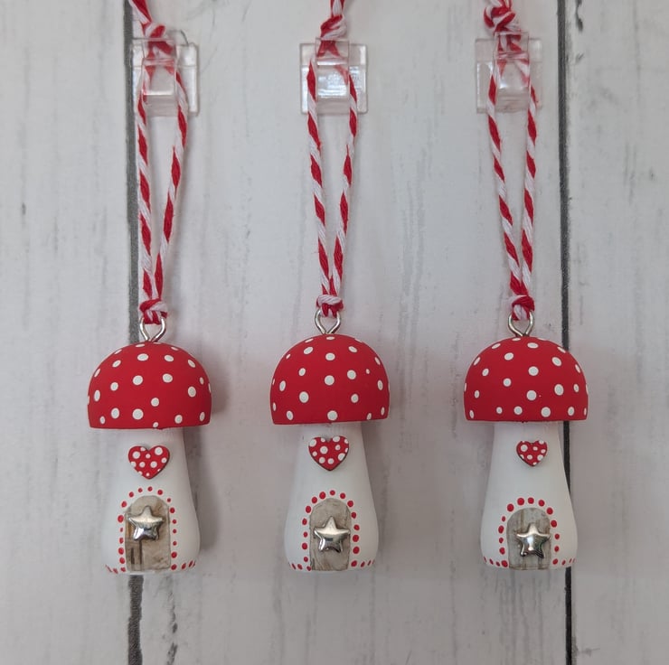 A trio of hand painted Christmas Toadstools in classic red and white, perfect for your Christmas tree this festive season.