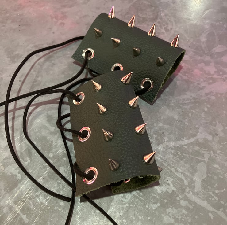 The specs on these WHDs are quite simple. They measure 9cm X 10cm. The green leather is a soft 2.0 oz leatherweight, with 12 chrome coloured 7mm spikes/cones strategically placed on each WHD (that's 24 in total). A leather lacing is given for each WHD. (sold as a pair)