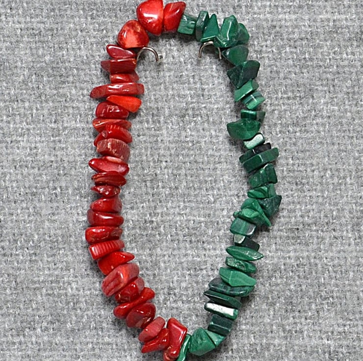 Malachite Chip and Red Bamboo Coral Chip Elastic Half and Half Bracelet