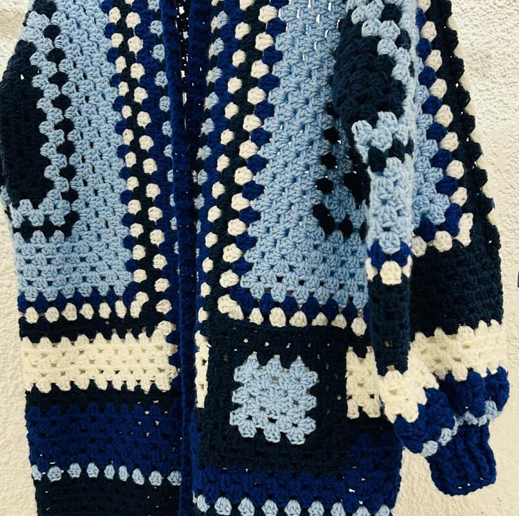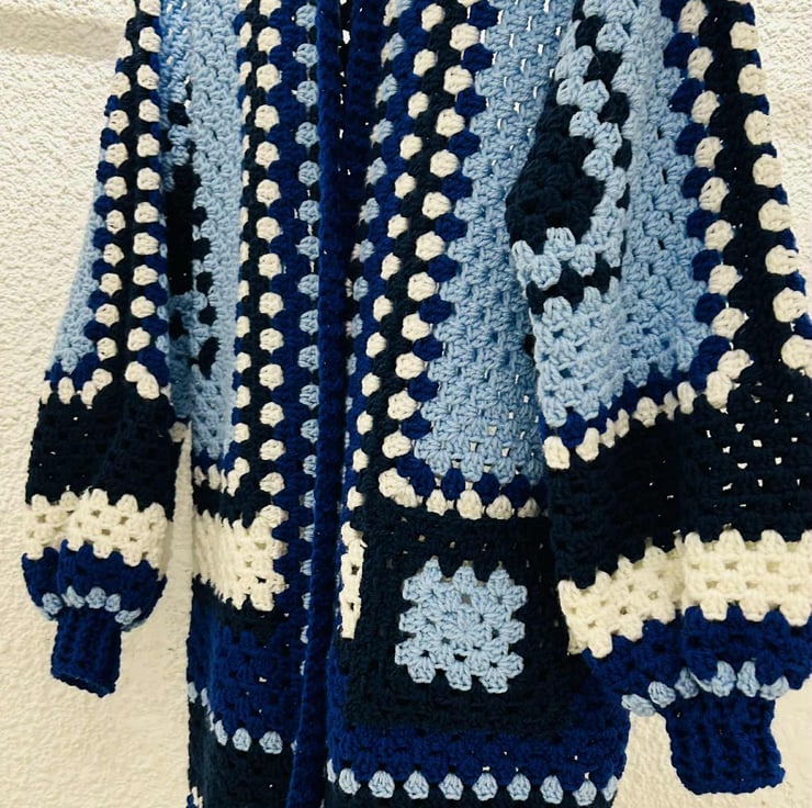 Hexi cardigan, long, in different shades of blue: navy blue, cobalt blue, baby blue, aqua blue and white. The chest circumference 112cm, Length 86 cm. Unisex.
