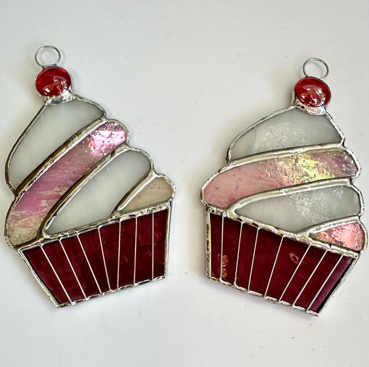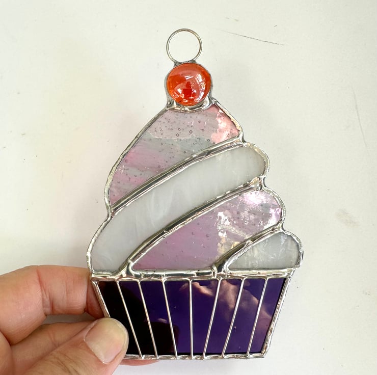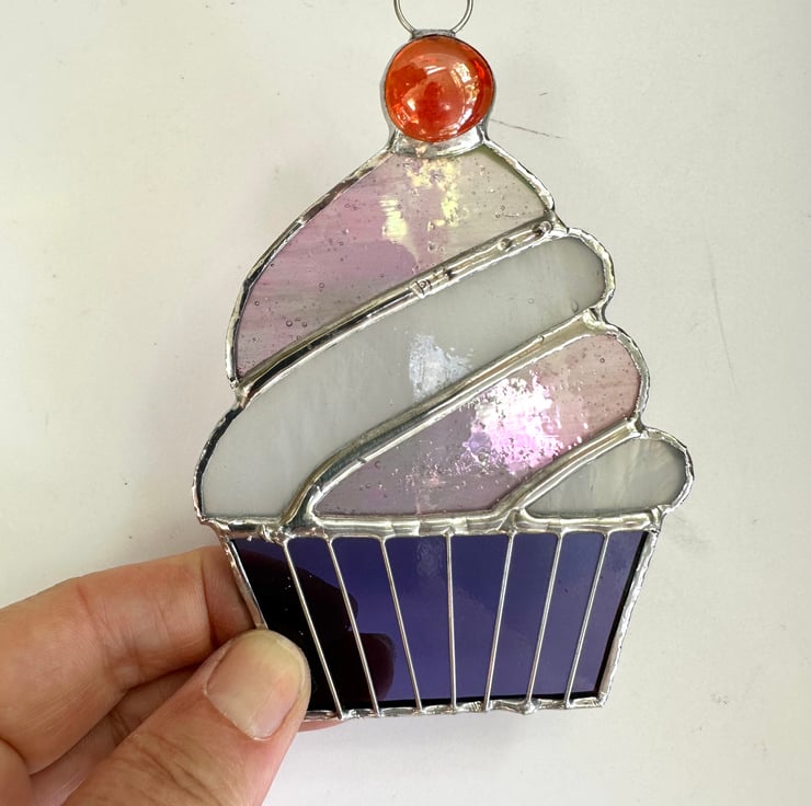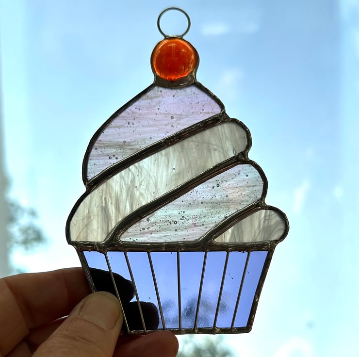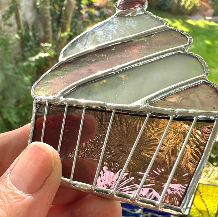 Each piece of glass has been cut by hand, ground, washed, foiled and soldered together the washed again. I have added a red glass nugget for the cherry on top of the cake and the paper case detail is tinned copper wire. I’ve attached a ring for hanging purposes.