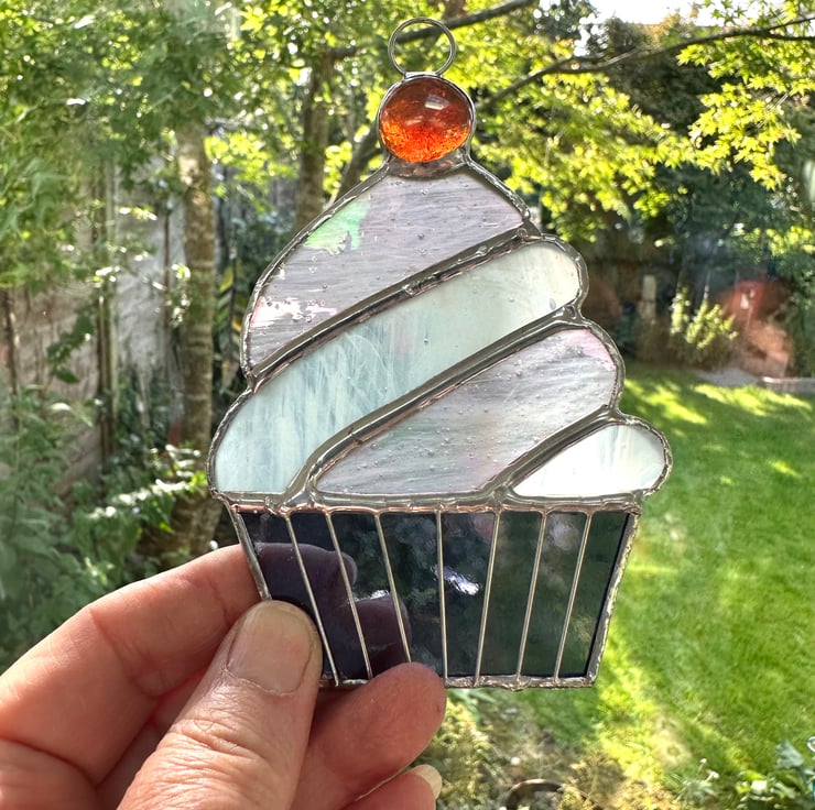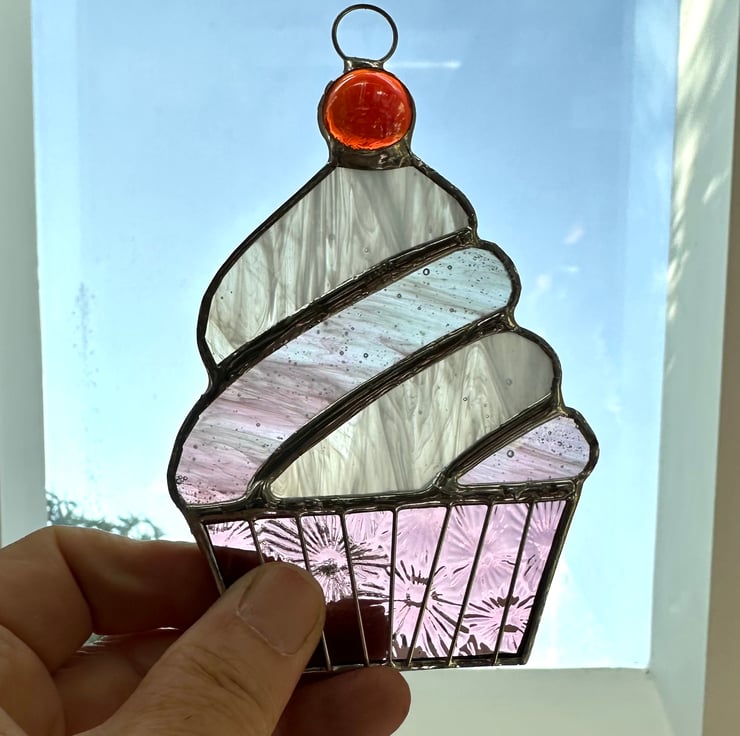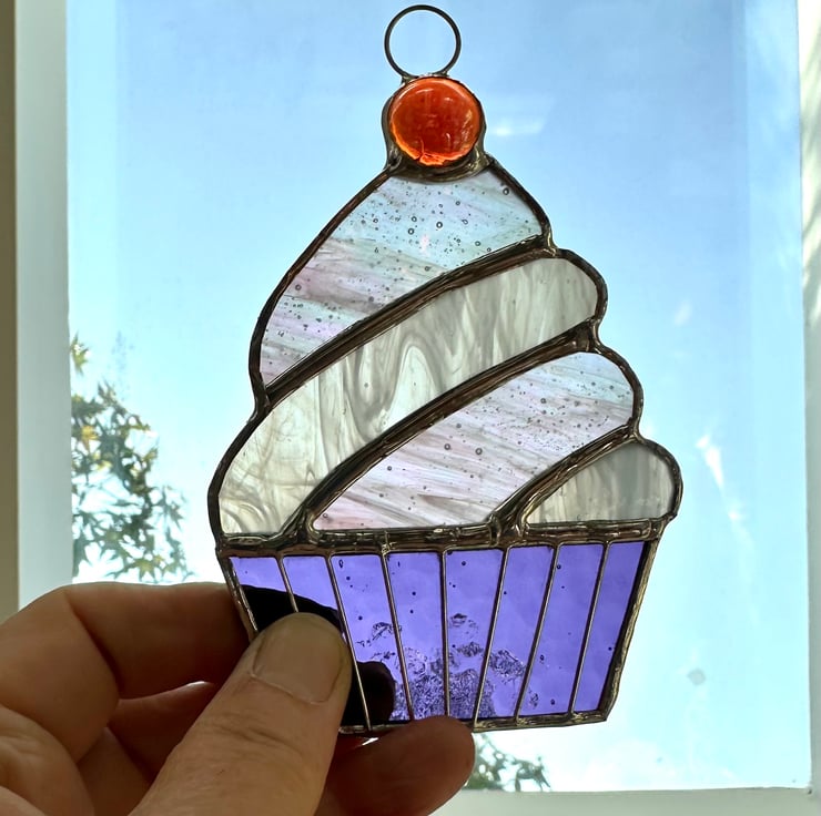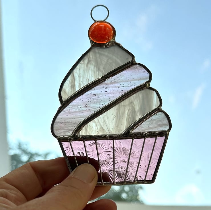 Cup cake suncatcher handmade in beautiful stained glass by Carole's Glass.