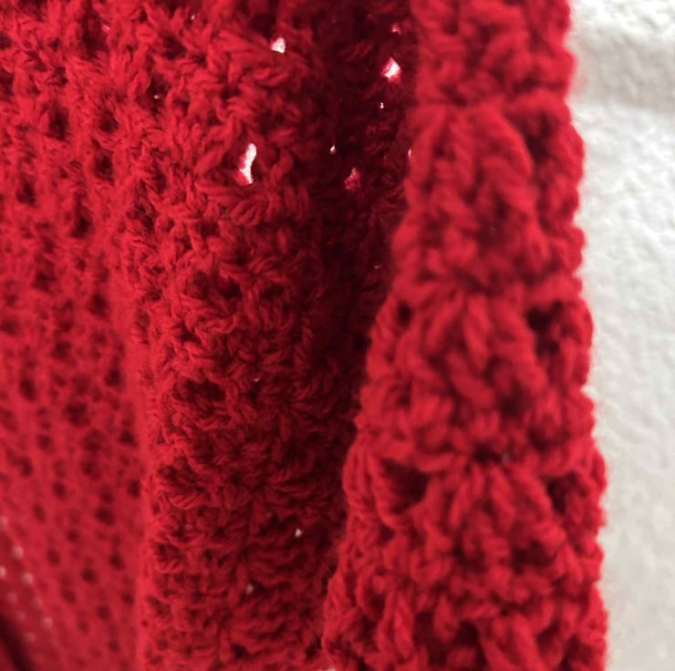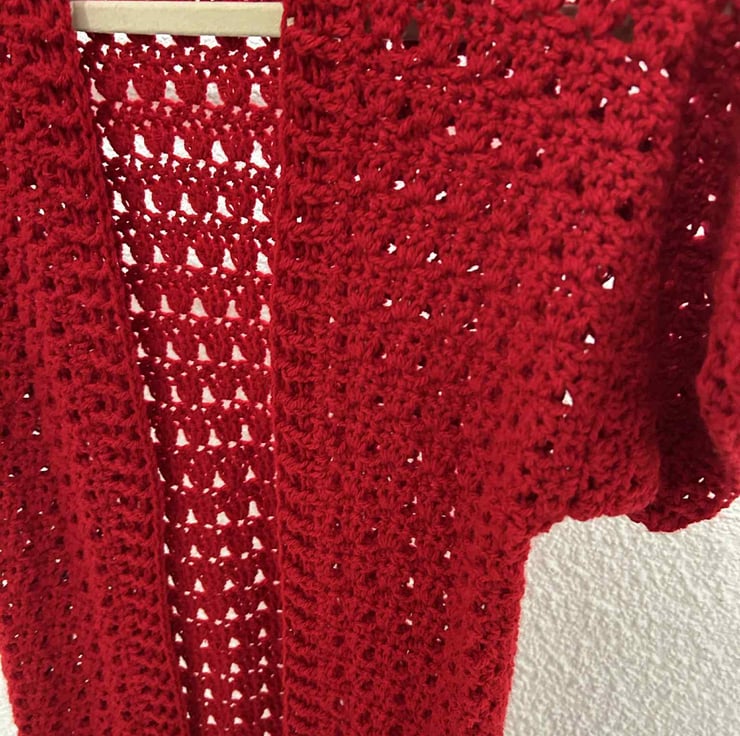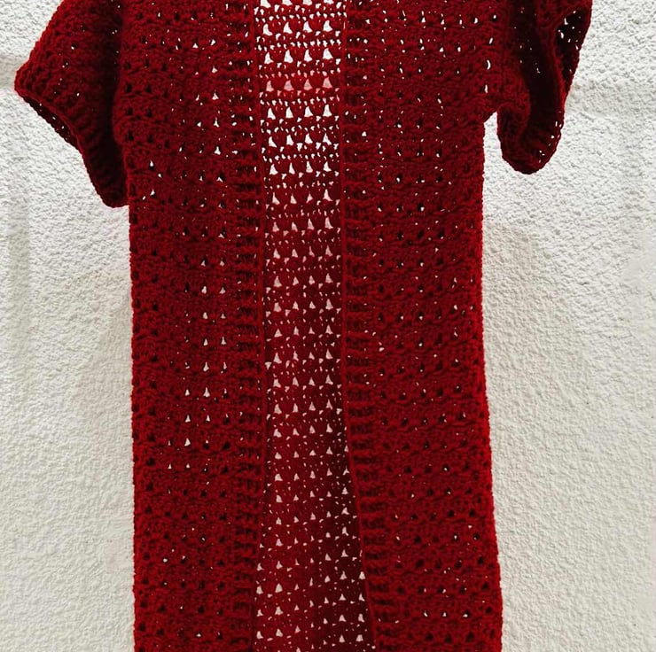 Strong red colored long cardigan. Worked in one piece, sewn at the shoulders. Granny pattern and finished with front and back loop twisted stitch. Back size 54 cm ,Length 100 cm. Short sleeves.