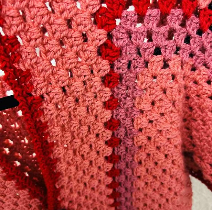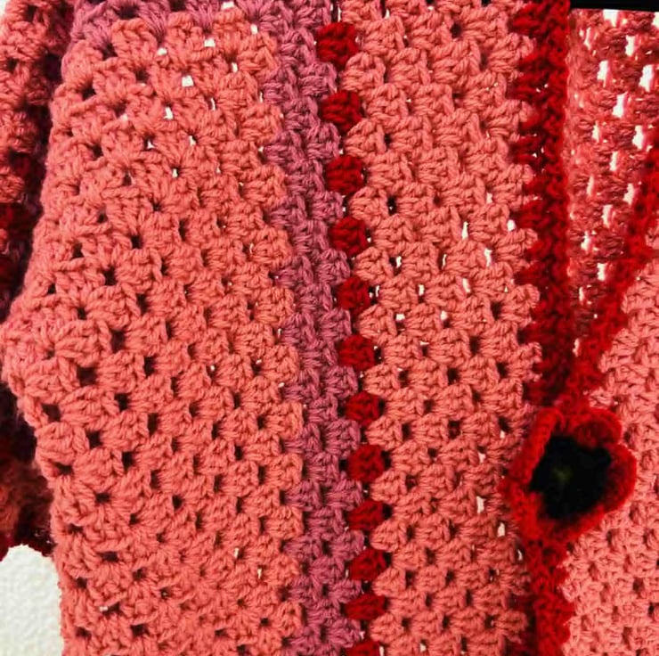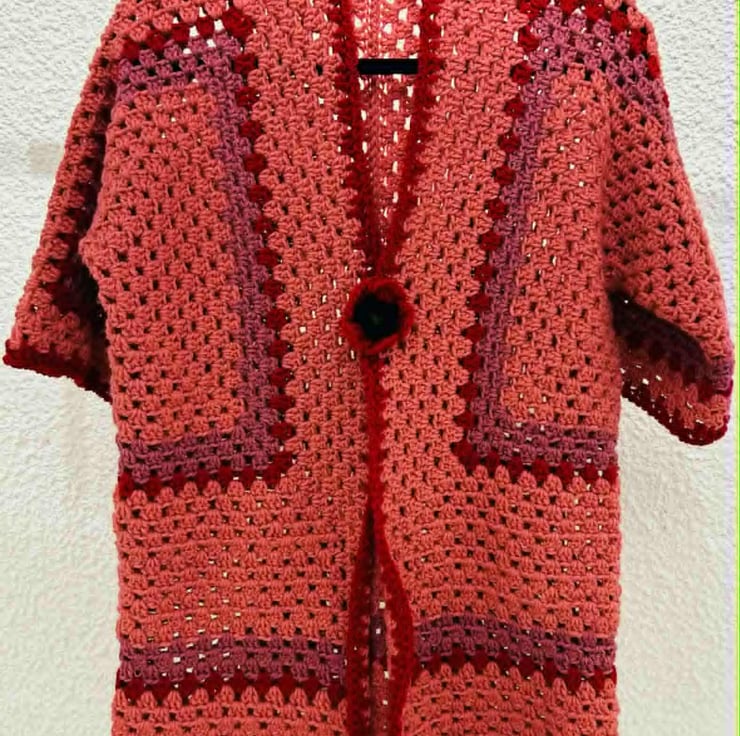 Hexi cardigan, long. Coral- red. Back size 54, Length 71 cm. Unisex. It can stretch due to the yarn and pattern.