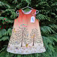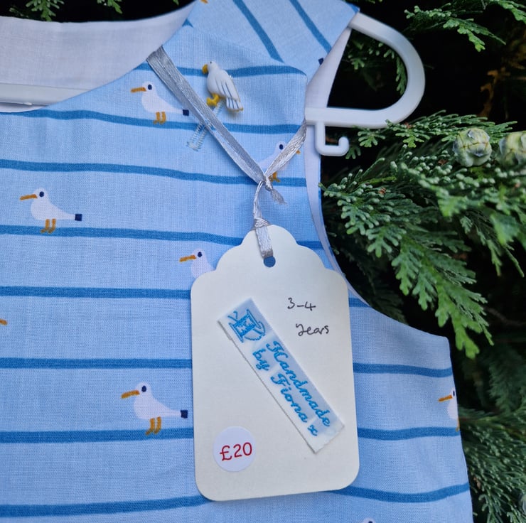 A fully lined A-line summer dress. Made from a pale blue cotton fabric with a print of seagulls sitting on blue stripes and with plastic seagull shaped buttons. Can be worn with a T shirt underneath, tights and a cardigan for colder days.