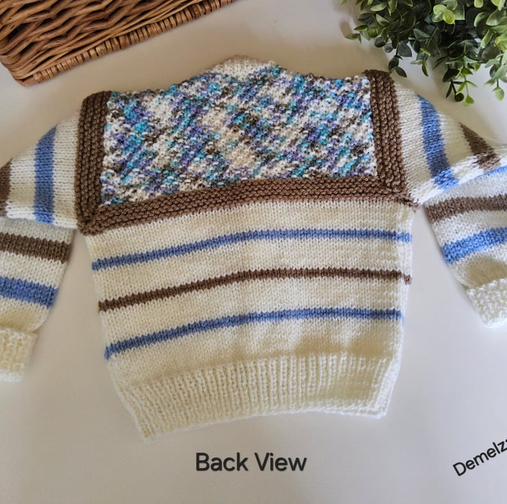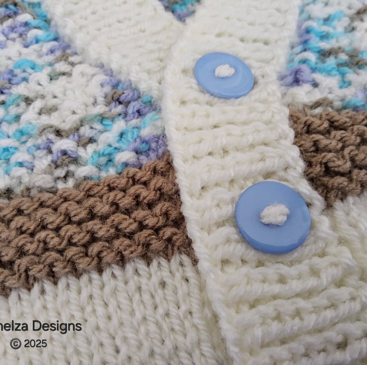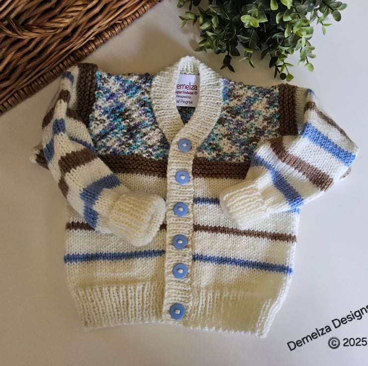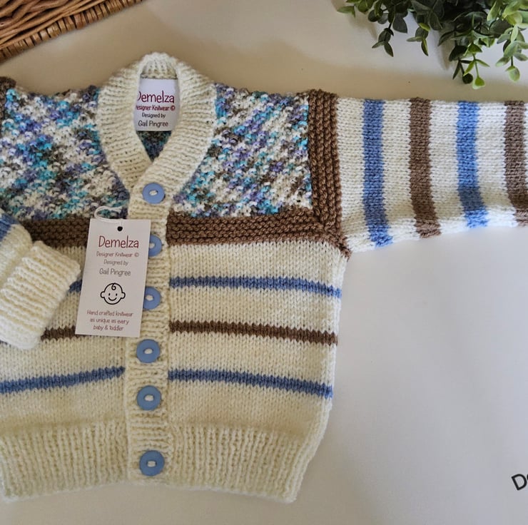 A unique eye catching practical baby boy's cardigan designed and totally hand crafted in Cornwall using top quality premium branded designer acrylic machine washable yarns. The colours are perfect to be worn with most boy's clothing collection whilst proving versatility of colourways.