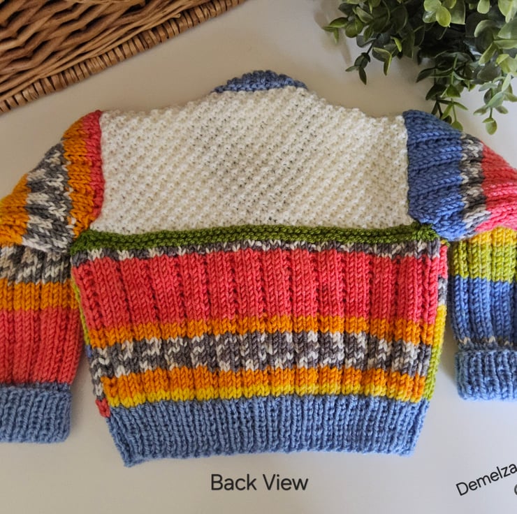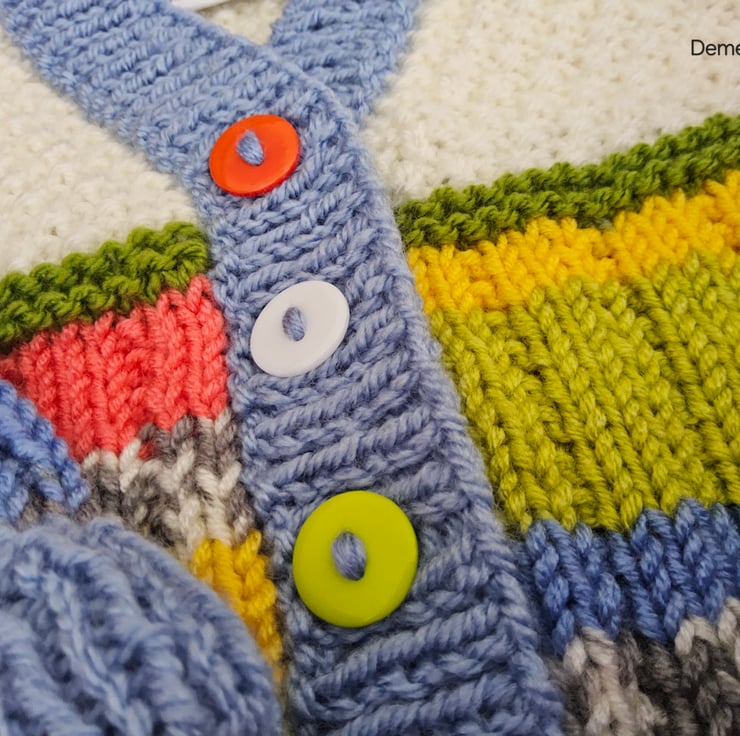 A unique eye catching practical baby cardigan designed for either sex and totally hand crafted in Cornwall using top quality premium branded designer acrylic machine washable yarns. The buttons are made from genuine wood with a sweet sentiment burnt etched on them.The branded Demelza Designs garment label is attached to the back neck edge with the care instructions woven within it on the reverse side for lasting reference. A Demelza Designs garment swing tag will be attached to the front prior to dispatch for a professional touch if gifting.