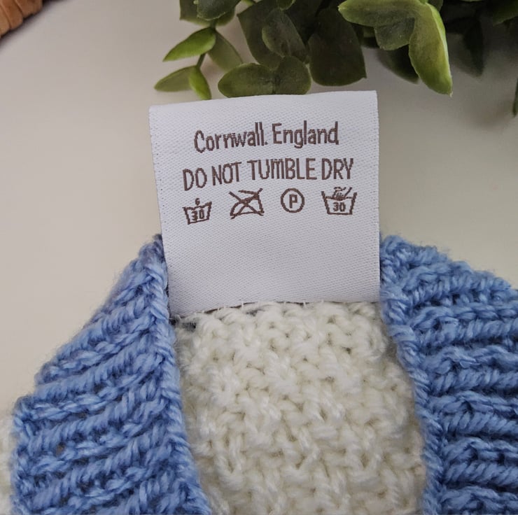 Baby knitwear is designed and hand crafted by Demelza Designs in Cornwall meeting UK baby safety standards, Only branded premuim acylic, acrylic/natural fibre blends or pure natural fibre yarns are used in baby knitwear which conforms to BS984/76 standards.