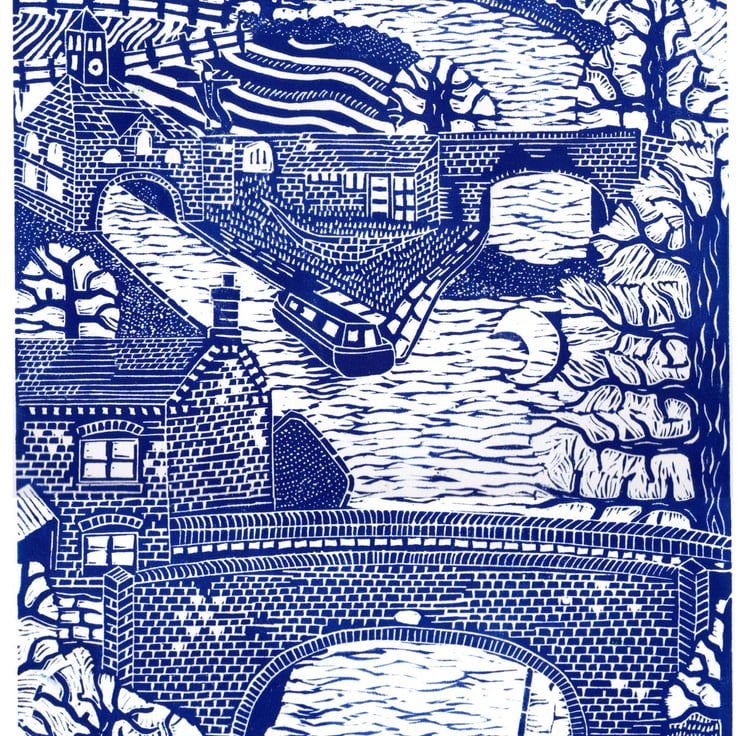 Linocut print, View Over Apple Pie Lane Bridge, Nuneaton, by John Freeman
