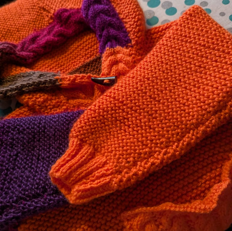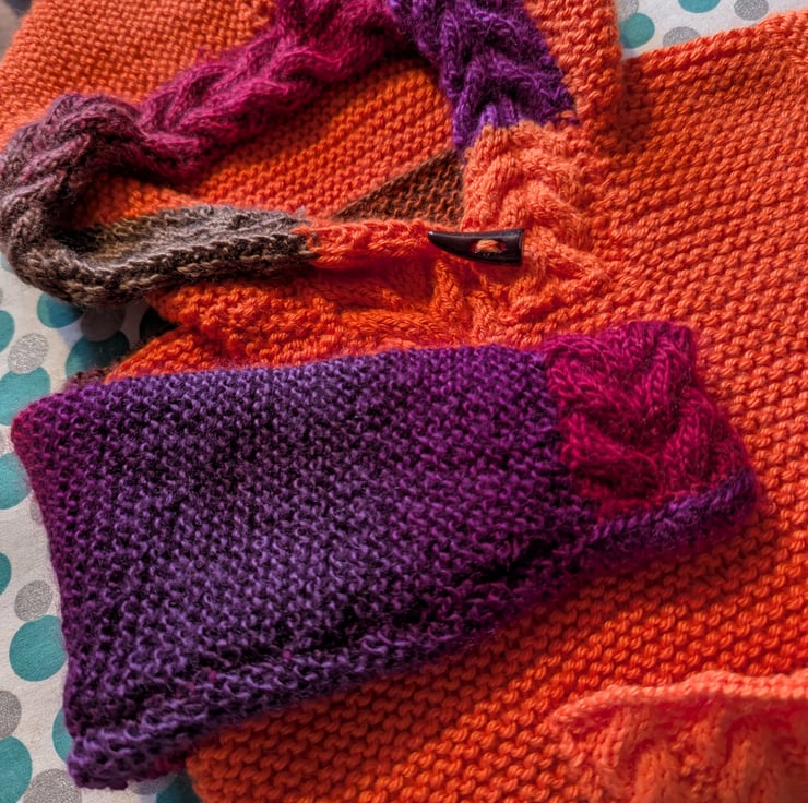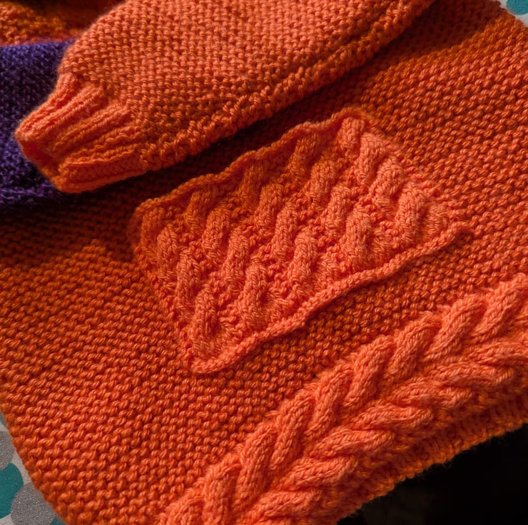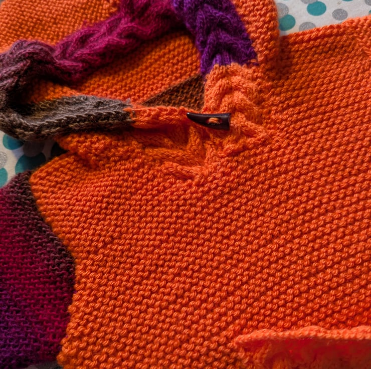 Fits 2 to 3 year old boy or girl, in a mix of bright colours and textures. Garter stitch body and sleeves, with borders of either ribbing or welts in cable stitch to add that extra touch. The hood and neck are framed in the welt cable strip. Hood topped off with a colourful pompom. With addition on the front of a cable stitch pocket. Knitted in both Softease Aran and Cygnet boho.