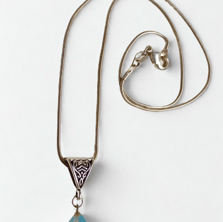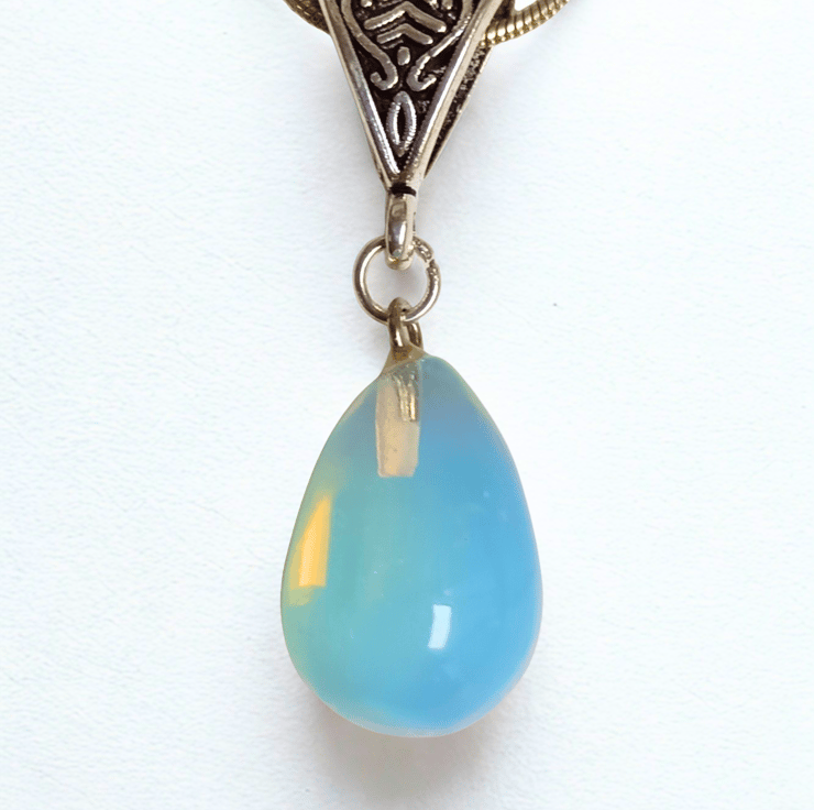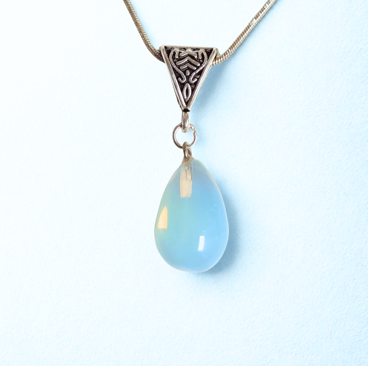 A mesmerising synthetic opal stone hanging with a decorative embellished Tibetan silver hanger. This opal stone gives a beautiful display of shifting hues of colour which change depending upon the angle in which it is held. It will give a vibrant display of the spectrum which is distinctive of the opal stone which is a symbol of love.