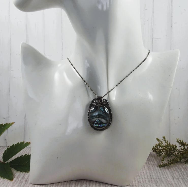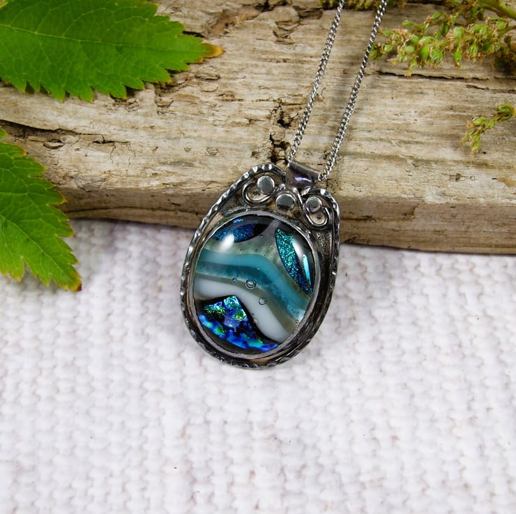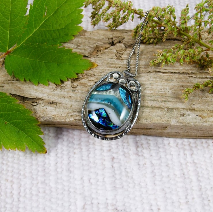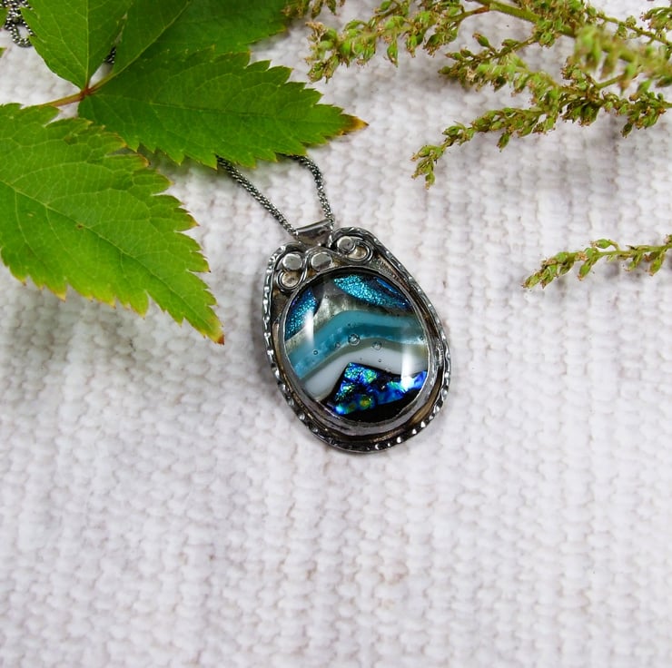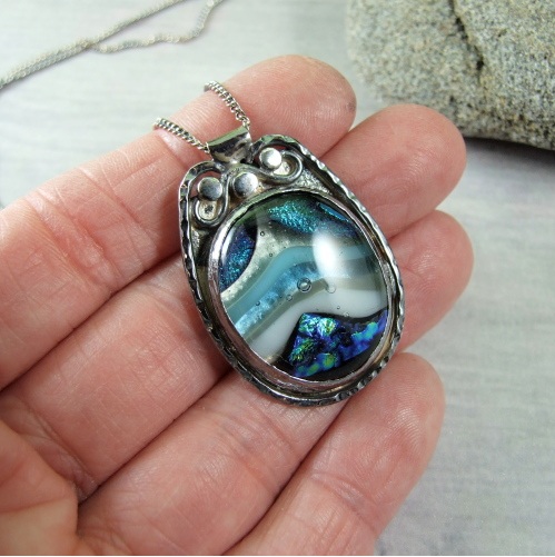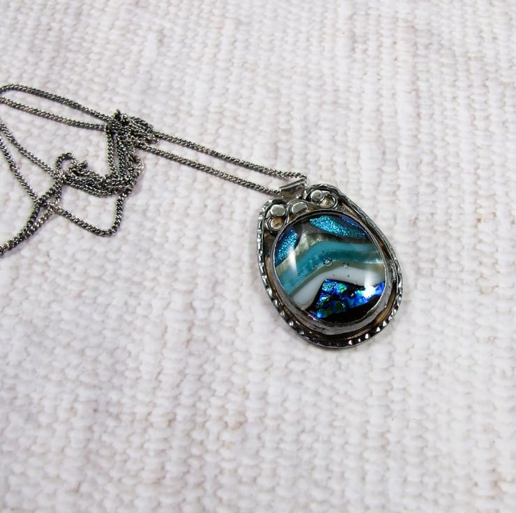 Waves Necklace. Sterling Silver and Dichroic Glass Cabachon pendant.