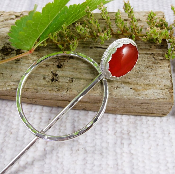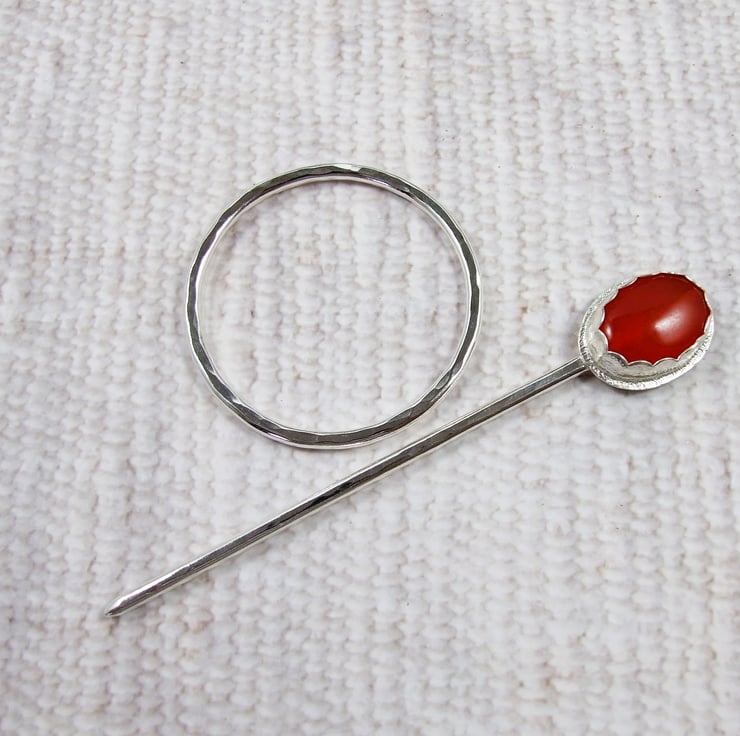 I have made the ring from 2mm solid Sterling Silver wire with hammered texture. The pin is made from 2mm wire, shaped with a rounded blunt point and at the other I have added a silver bezel and set with a small 15mm red quartz gemstone.
