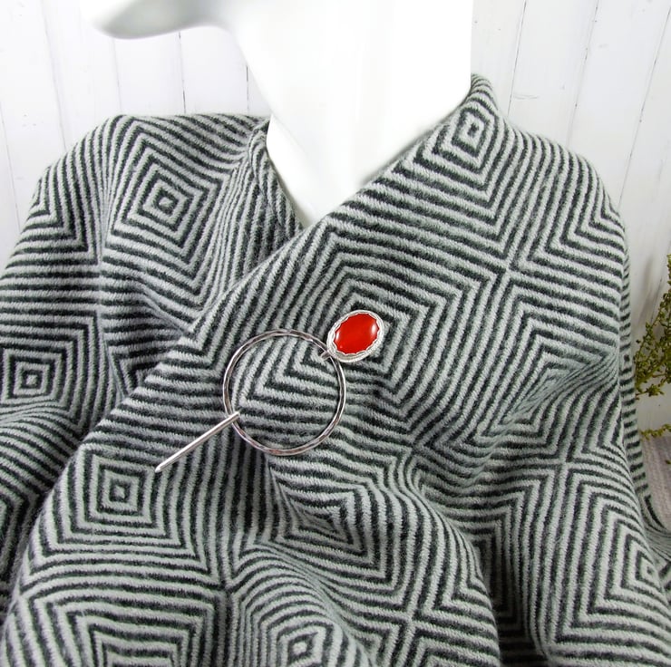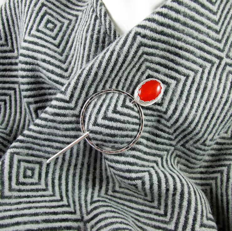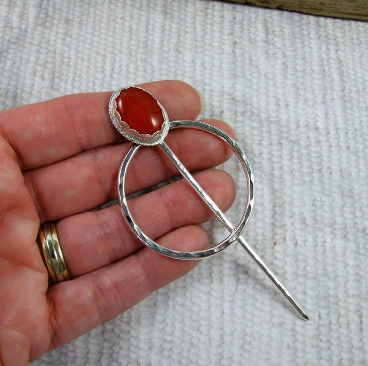 Hand forged hammered Sterling Shawl Pin with Red Quartz Topped Pin for Open Weave or Knit Shawl, Scarf, Wrap or Cardigan.
