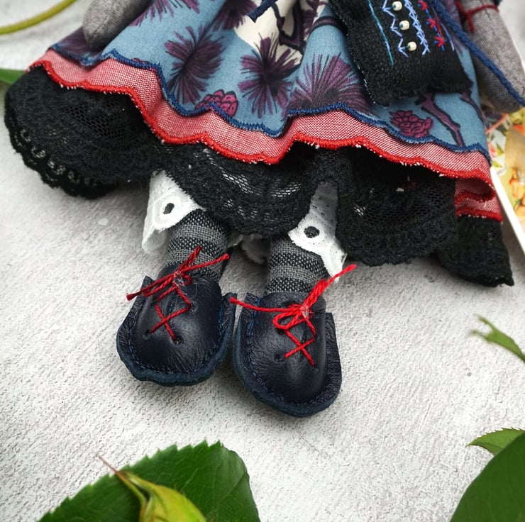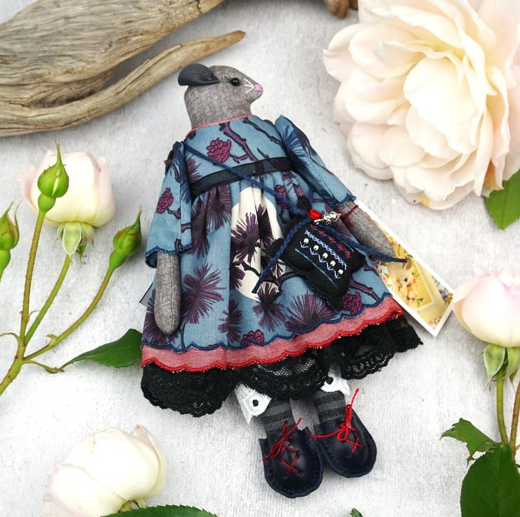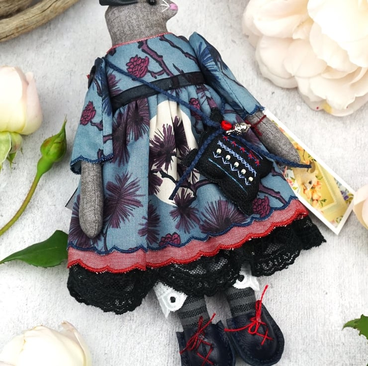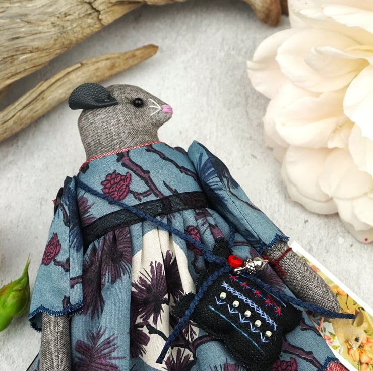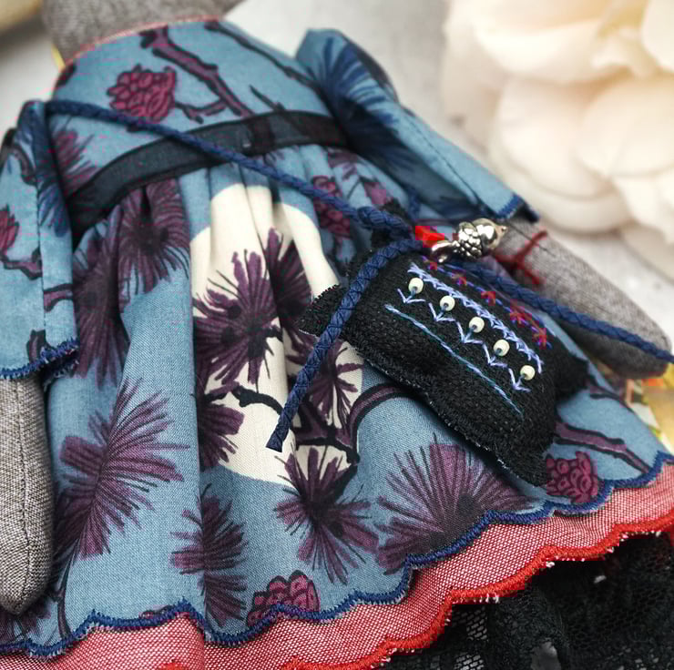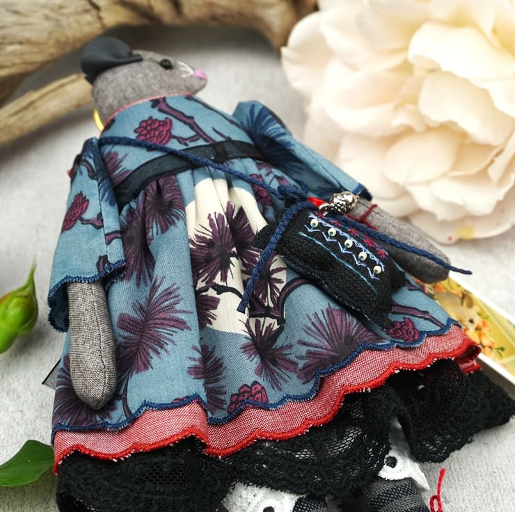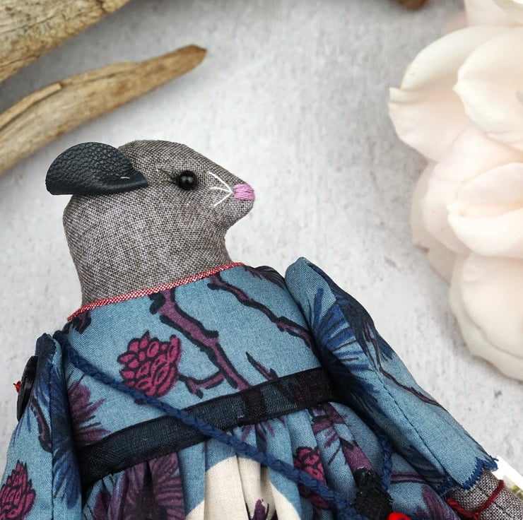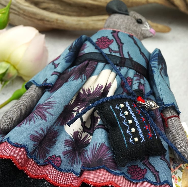 This is Amice, a tiny twilight mouse. She is a hand embroidered mouse with little leather ears and tail. She is dressed in a Liberty tana lawn cotton called Hiro, the dark blue version, a dark blue ground with black spruce outlined by the shining moon. She has coordinating underskirts in red chambray cotton, black tulle mesh and white cotton lace bloomers. Her dress is finished with organza ribbon, tiny buttons and little leather shoes. She is a dark mouse with dark grey ears and tail, white whiskers and an embroidered pink nose.