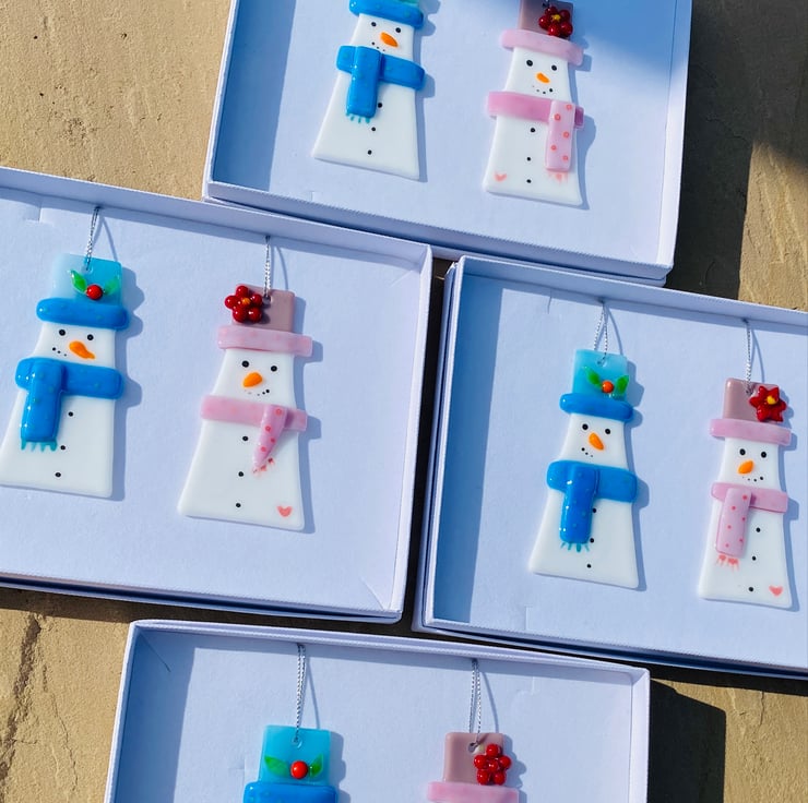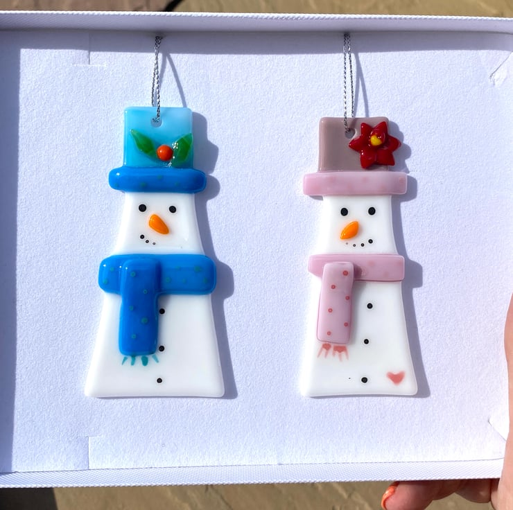 Super cute snowmen dressed in a top hat and scarf . The man has a glass sprig of holly and the lady a red flower . Perfect gift for romantic couples and newly weds . Each snowman is approximately 4 inches and they come in a white gift box which is also handy for storing .