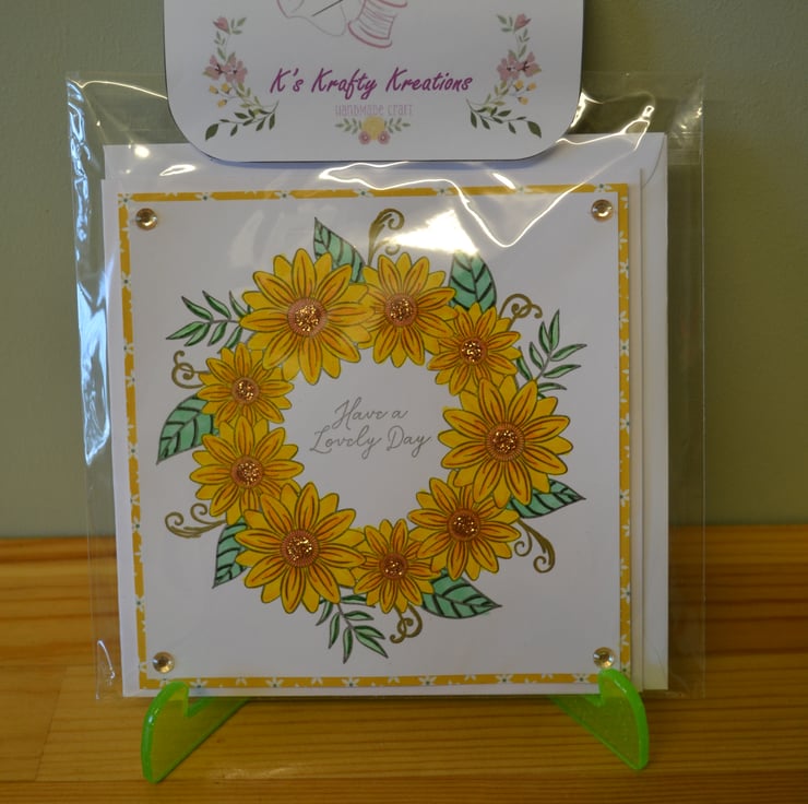 This cheerful greeting card features a hand-coloured wreath of sunny yellow flowers inspired by sunflowers and daisies, surrounded by fresh green leaves and delicate golden swirls. At the heart of the design is the uplifting message, “Have a Lovely Day”, written in elegant script.