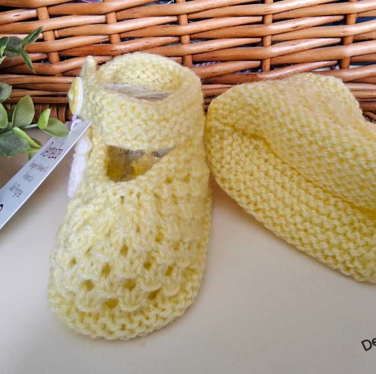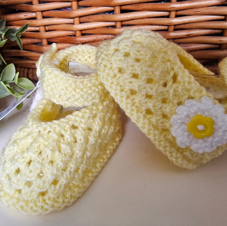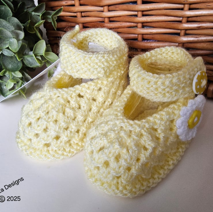 A beautiful pair of unique baby girl's knitted shoes designed and totally hand crafted in Cornwall. They have been created from branded machine washable premium acrylic yarns. The white flowers has been hand crocheted complimented with a flower shaped buttons in the centre. The shoe straps also have wooden buttons with a polkadot design on them. The total time from start to finish took over three hours to lovingly create these shoes. On the inside of one shoe the luxury woven soft damask garment label has the care instructions on the reverse side.