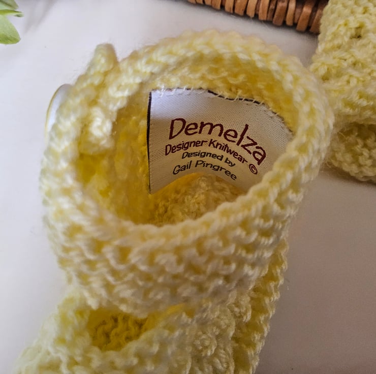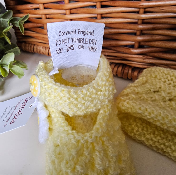 Baby knitwear is designed and hand crafted by Demelza Designs in Cornwall meeting UK baby safety standards, Only branded premuim acylic, acrylic/natural fibre blends or pure natural fibre yarns are used in baby knitwear which conforms to BS984/76 standards.