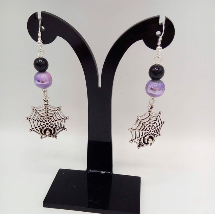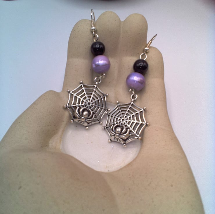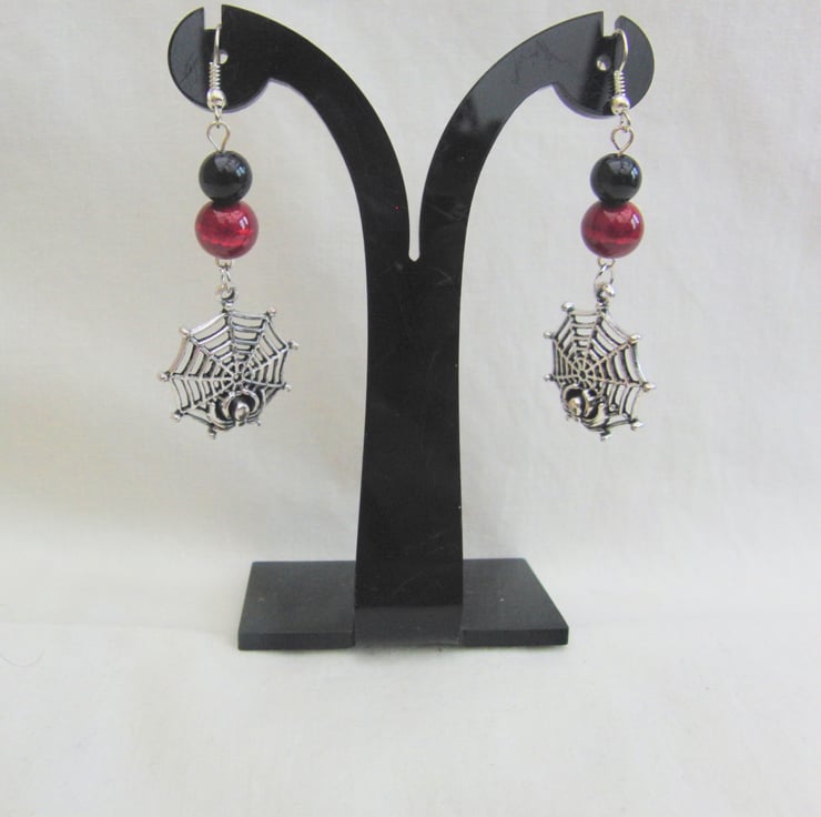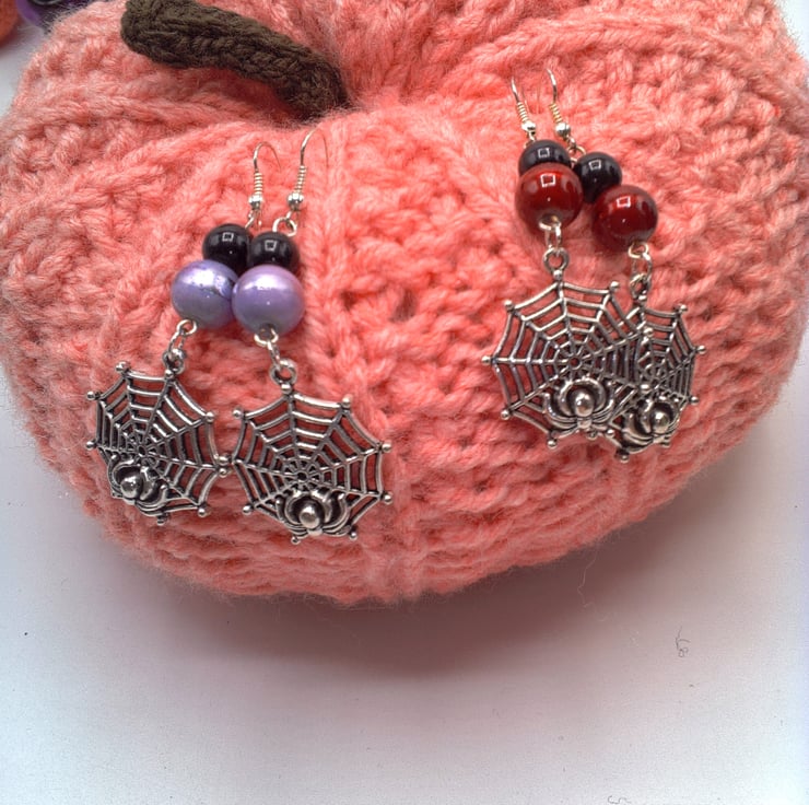 These novelty earrings would look great with any outfit you choose to wear casually or for a Halloween party. They would make a lovely fun gift for a friend or relative for a birthday or to make someone smile, or a treat for yourself to wear to a party. They are made using 10 mm red or purple bead and an 8 mm black bead with a silver plated spider's web charm measuring 25 mm in diameter. The earrings have a drop of 2.5 inches (65 mm) from the base of the silver plated hook ear wires. The earrings will be dispatched wrapped in tissue paper in an organza bag and delivered to you via Royal Mail 1st class post.