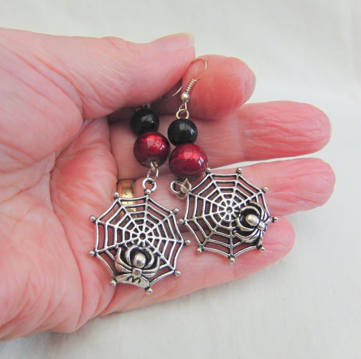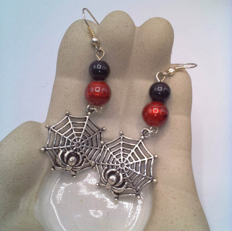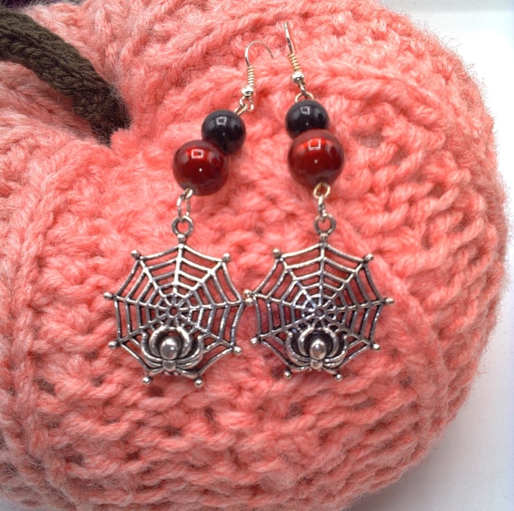 Silver Plated Spider's Web Earrings with Choice of Bead Colours, Spider Earrings, Bead Colour Choice, Birthday Gift, Halloween Gift, Gift for Her, Beaded Earrings, Novelty Earrings, Red and Black Earrings, Purple and Black Earrings