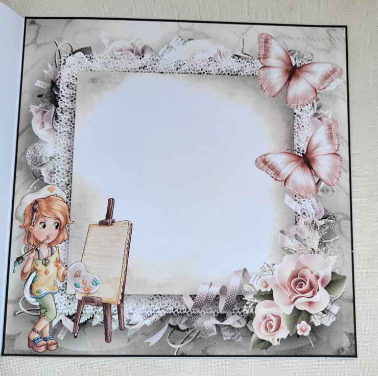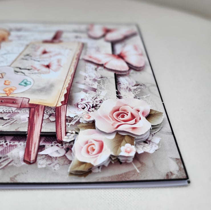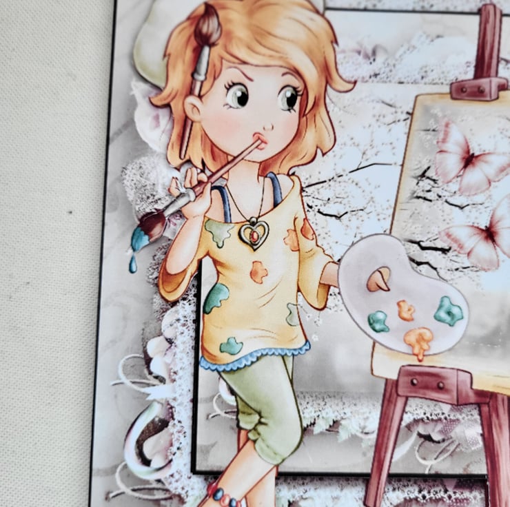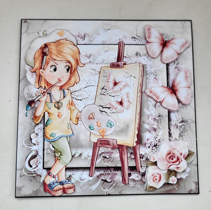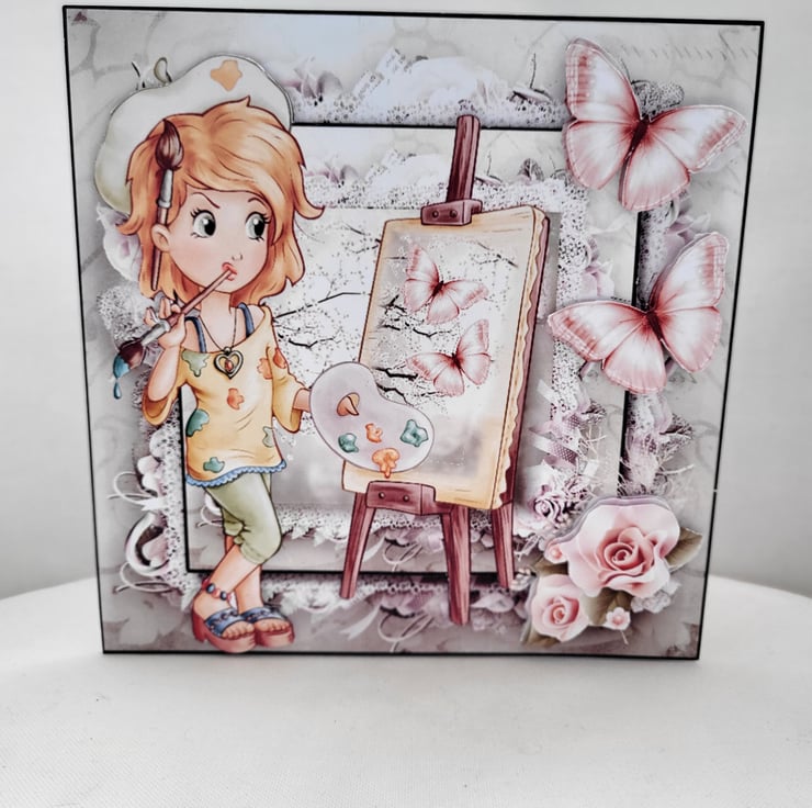 This is a large card measuring approx 8x8 inches. The image of a girl doing some art. The image is printed onto good quality pro print card and then I have hand cut each element out and layered up using foam tape to create depth and dimension.