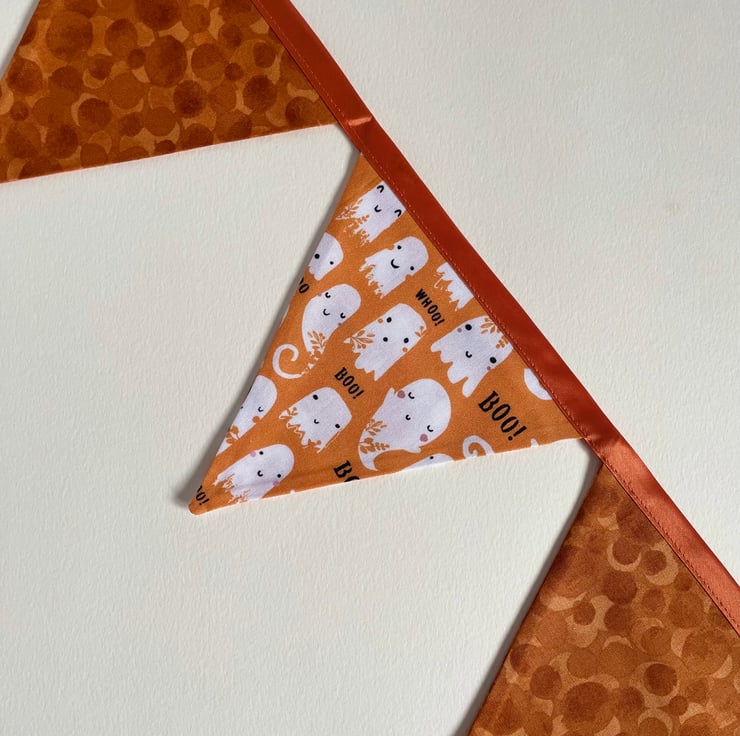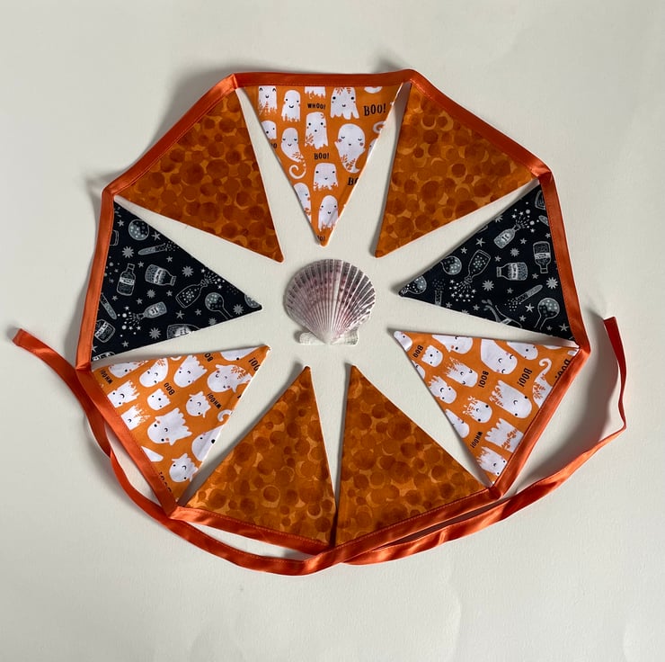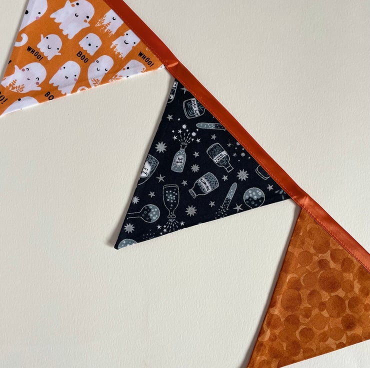 Halloween bunting with cute ghosts and potions, 206 cm long from one end to another. 9 double sided panels. The flags are approx 14 cm long and 14 cm wide at the top.