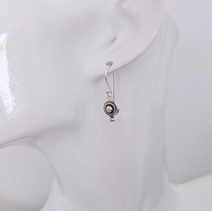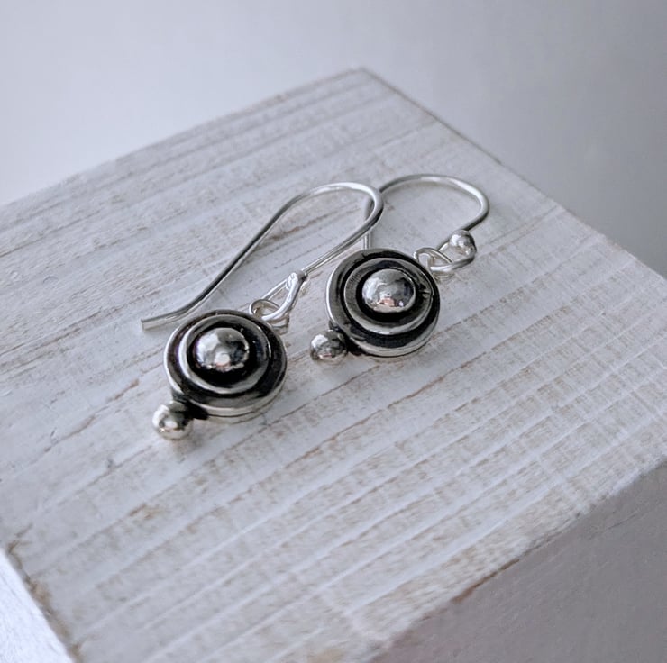 Circle and dot recycled sterling silver dangle earrings with a rustic, antiqued finish.