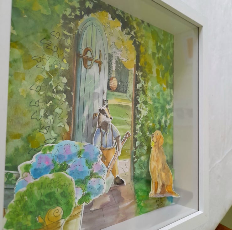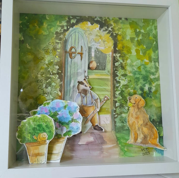 The Kay Dawson watercolours 8 X 8 Box Frame MONTY Badgers Morning Garden is a mixed media art piece that combines watercolour painting with collage elements. The artwork features a vibrant scene of badger in a morning garden, showcasing both the beauty of nature and the unique style of Kay Dawson. The 8 x 8 box frame allows for easy display and framing, making it a versatile addition to any art collection or living space.