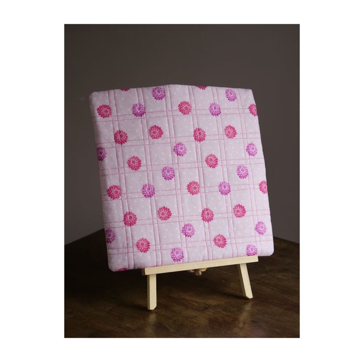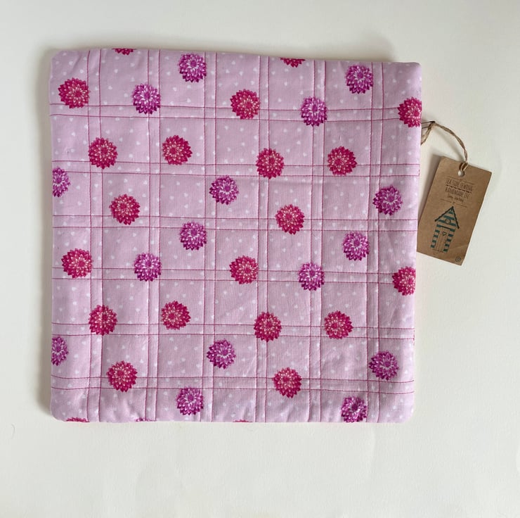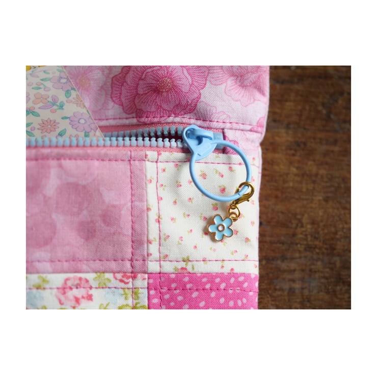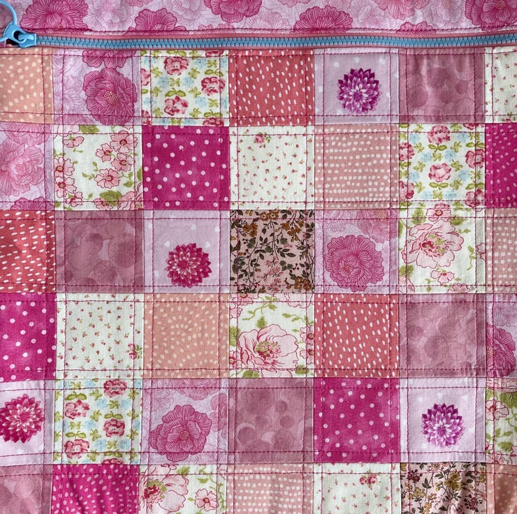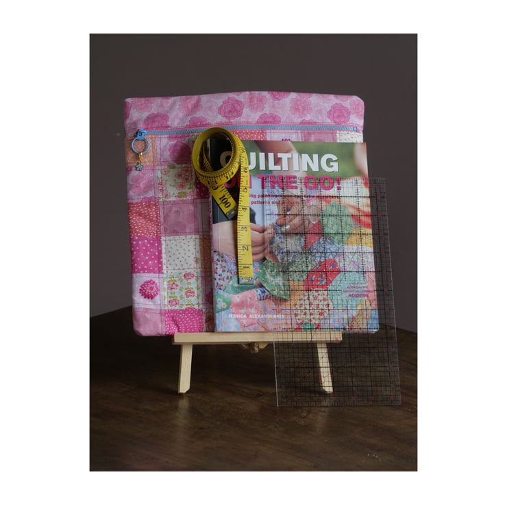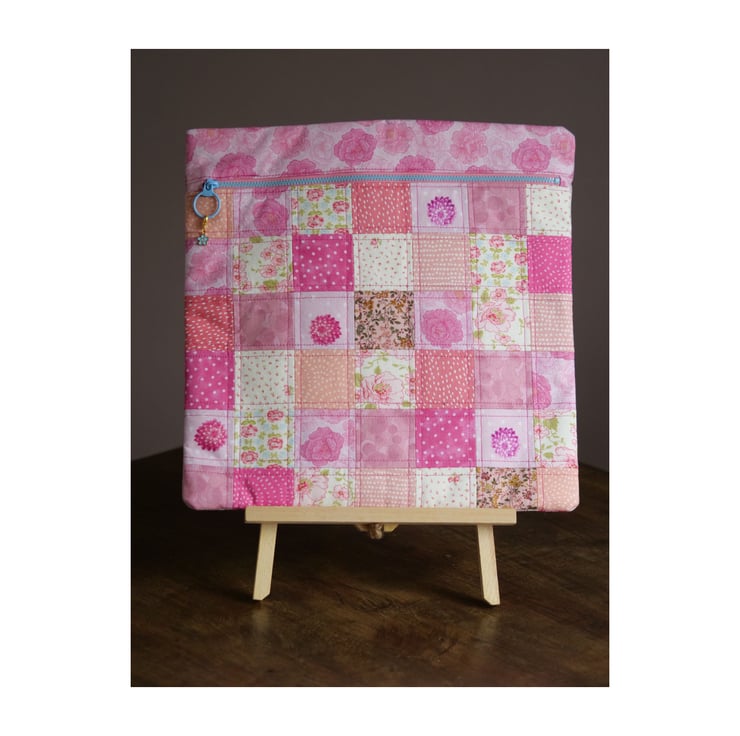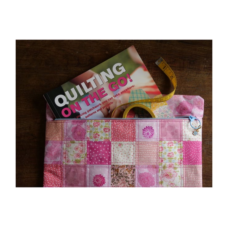 Patchwork and quilted project bag. 32 x 32 cm big with 30 cm zipper. Perfectly fits A4 size notebooks. Lined inside.