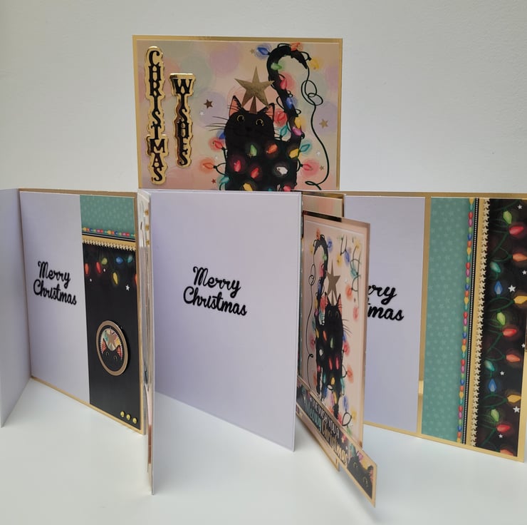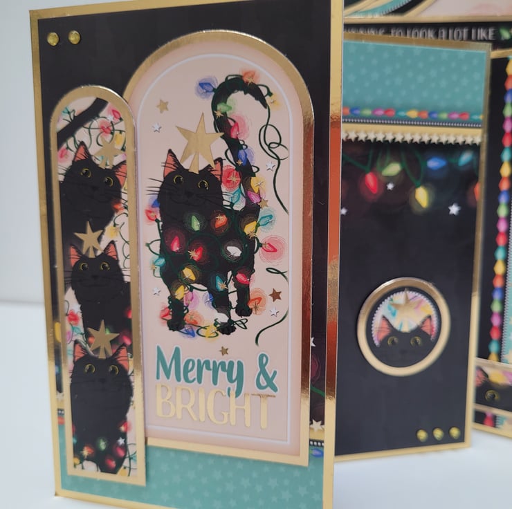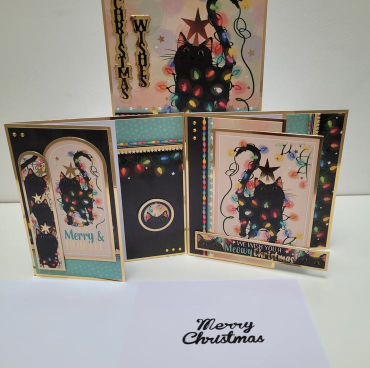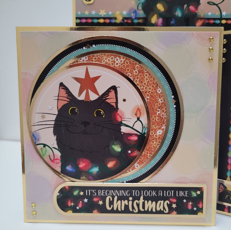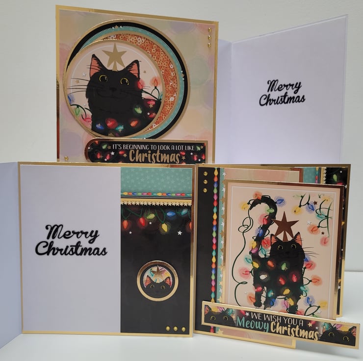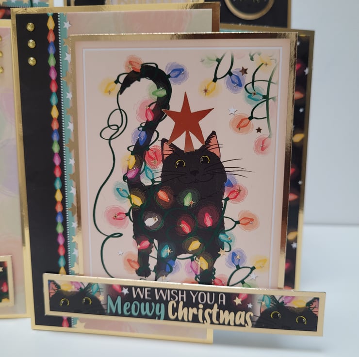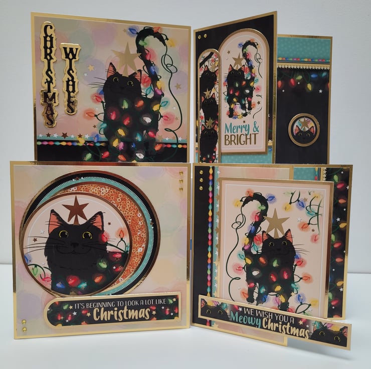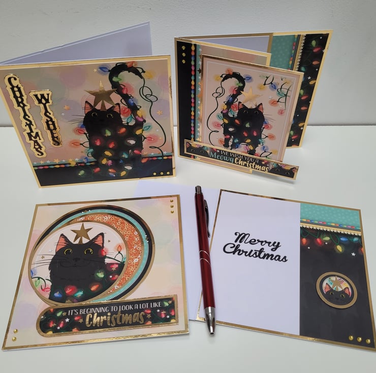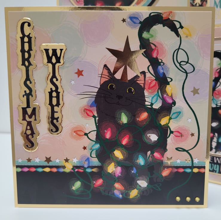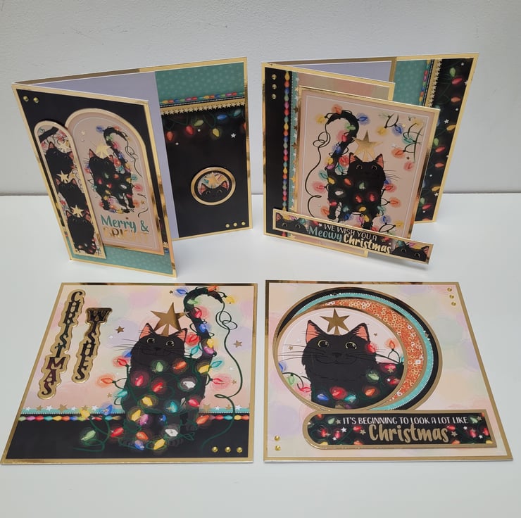 A fun set of 4 Christmas Cards featuring images of a cute black cat tangled amongst Christmas lights, accented with gold mirri™ card, gold foiled sentiments and gold diamante embellishments.