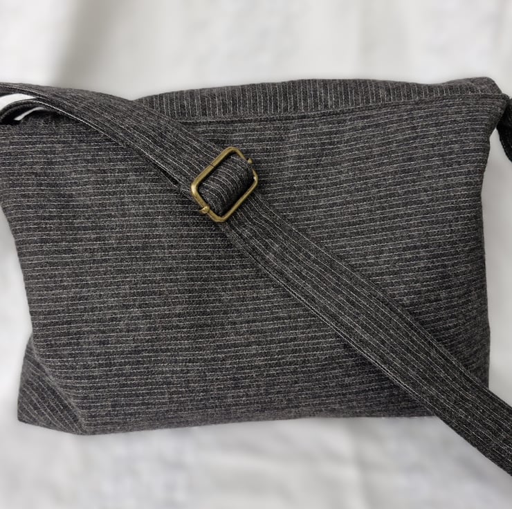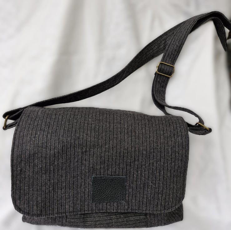 The main body and strap is made from a dark grey pinstripe wool mix flannel. The flap has a leather patch on the front above the closure.