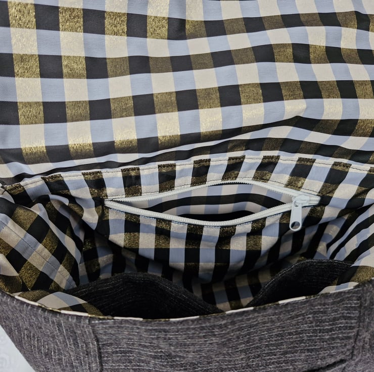 Inside is lined with a synthetic taffeta monochrome check fabric with on check having a metallic gold thread running through it..