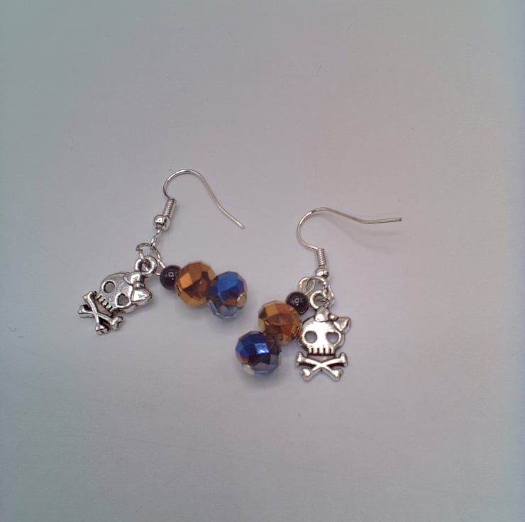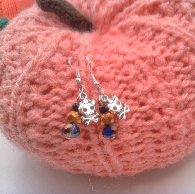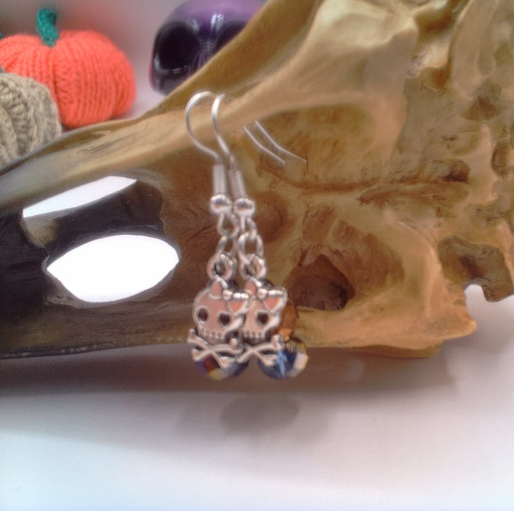 Halloween Cute Skull and Crossbones and Blue and Gold Crystals, Gift for Her, Halloween Gift, Halloween Earrings, Halloween Jewellery, Novelty Earrings, Novelty Jewellery