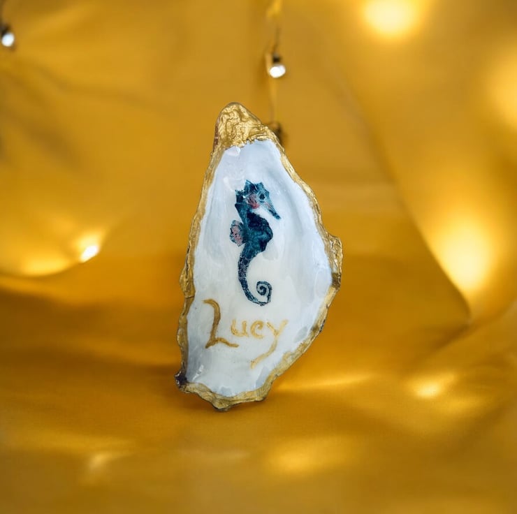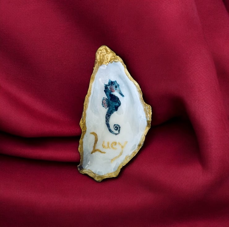 Seahorse Oyster Shell Decoupage - Large Deep Trinket Dish - 11cm in length and approx 3.5-4cm depth. Each shell is hand made therefore the size may vary from slightly smaller to slightly bigger but all roughly 10 - 12cm in length and depth is between 3.5 - 4.5. CAN BE LEFT BLANK OR PERSONALISED UP TO 10 letters.