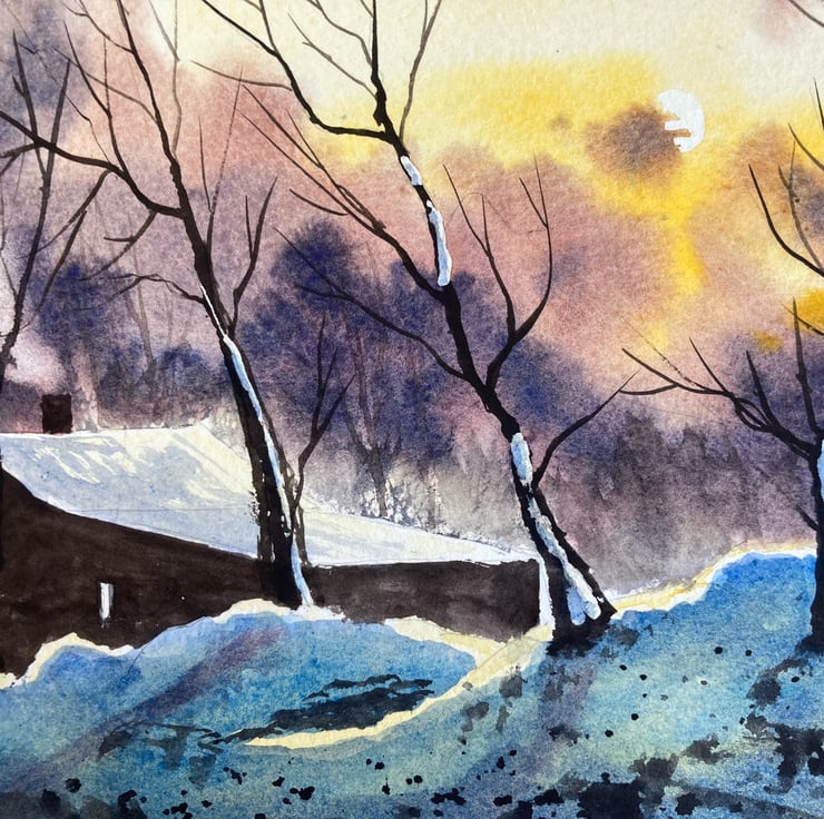 Winter cabin retreat nocturne (Original Watercolour FULLY MOUNTED 12” x 10”)