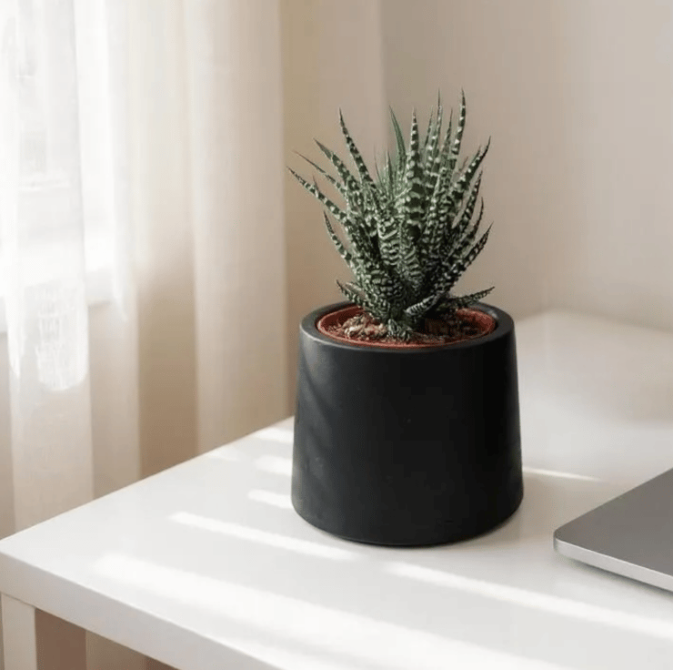 This small black plant pot is handmade from Cassini, a material commonly used for restoring and repairing marble and stone. It features a smooth and tactile finish similar to marble. It's neutral colour complements a variety of interior aesthetics, and its compact size allows it to be placed anywhere you'd like to add a touch of greenery.