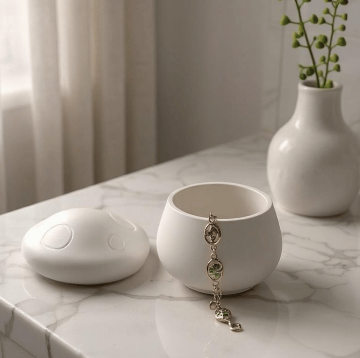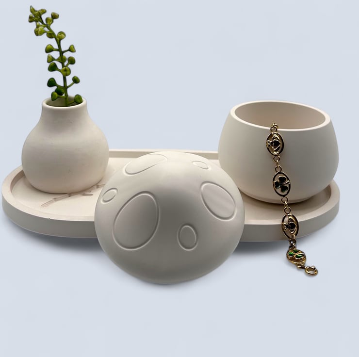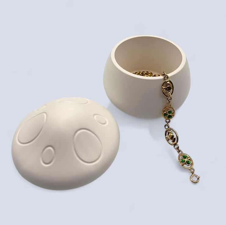 The box is handmade from a natural water-based mineral material with a hard stone-like finish. Each piece is made in my home studio, and subtle air bubbles or slight colour variations are part of the handmade process, giving every box its own individual character. The lid lifts smoothly to reveal a little space for rings, earrings or other small items.