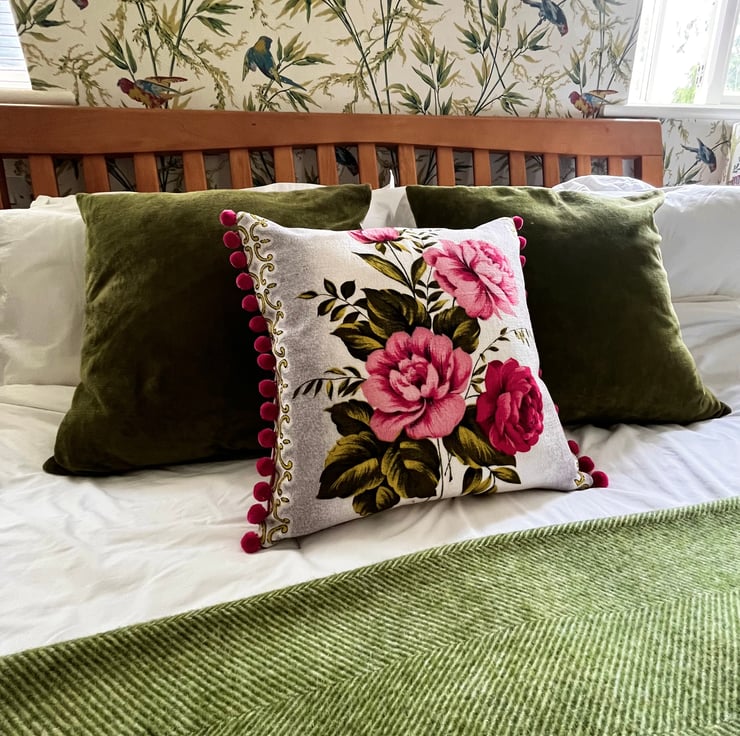 Vintage Rose barkcloth cushion cover with linen back and pink pompoms