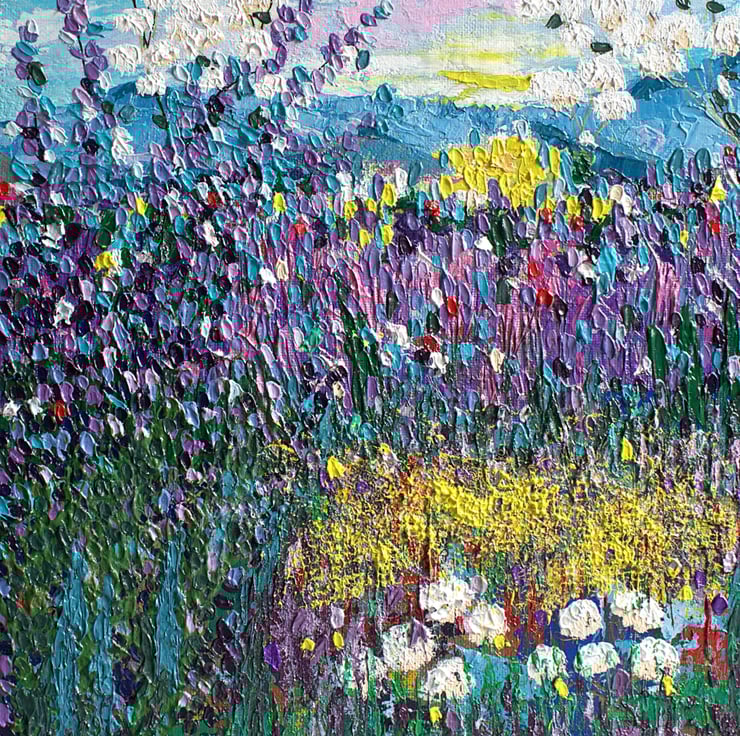 This is an original wildflower painting displaying a mass of lavender plants. This colourful painting on a canvas panel reminds us of how beautiful flowers are and how joyful they can make us feel I have used a range of different brush sizes and painting knives to complete this work. This painting is set in a contemporary wooden frame.