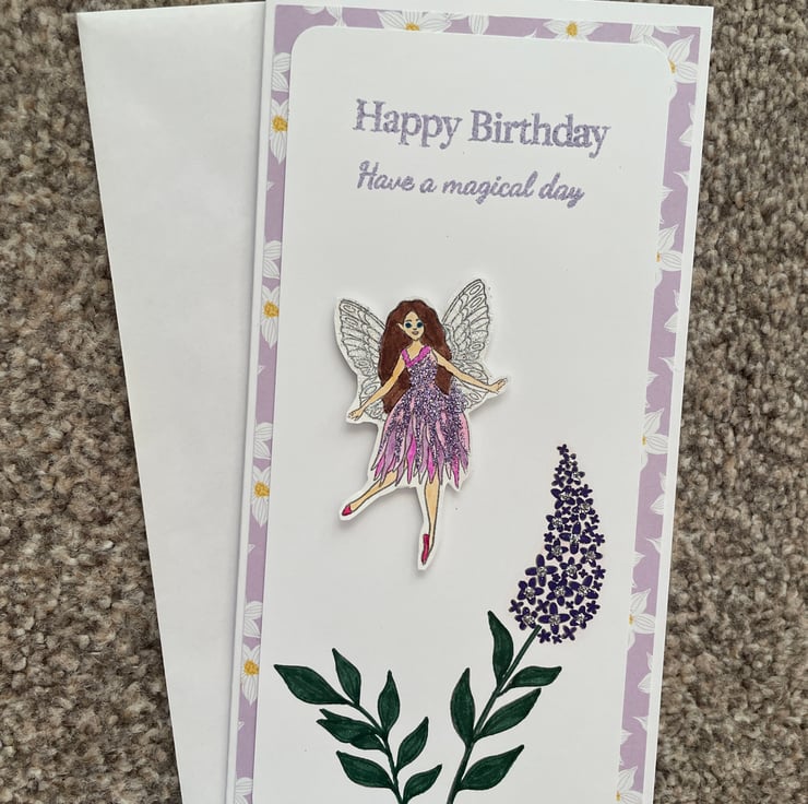 Bring a little enchantment to someone’s special day with this handmade fairy birthday card. The design features a charming fairy in a glittery lilac and pink dress, complete with delicate silver wings that shimmer in the light. She’s surrounded by hand-drawn floral elements, including a pretty purple flower stem, and framed by a soft lilac daisy-patterned border.