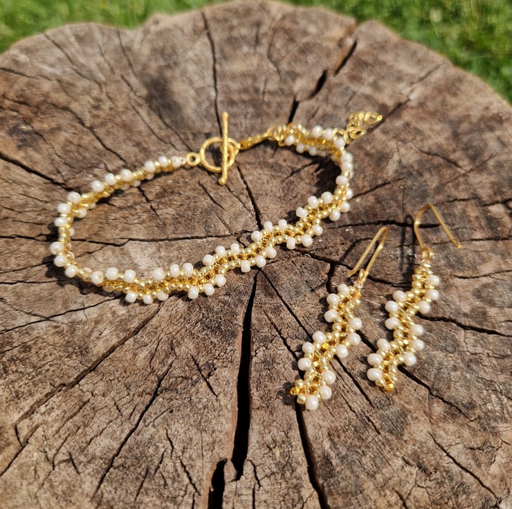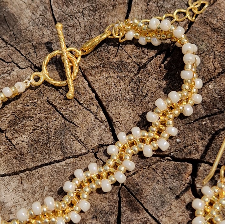 This sleek and chic wavy gold beaded bracelet with classic cream accent beads has been lovingly and mindfully created with glimmering gold seed beads and shimmering cream beads. The bracelet has a chic toggle clasp and is also adjustable, with a gold plated clasp and extender chain.