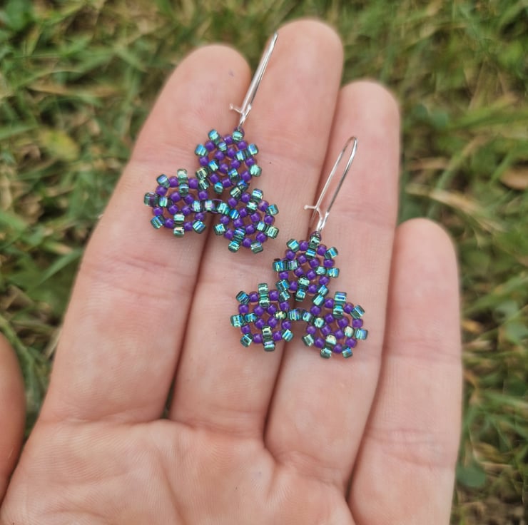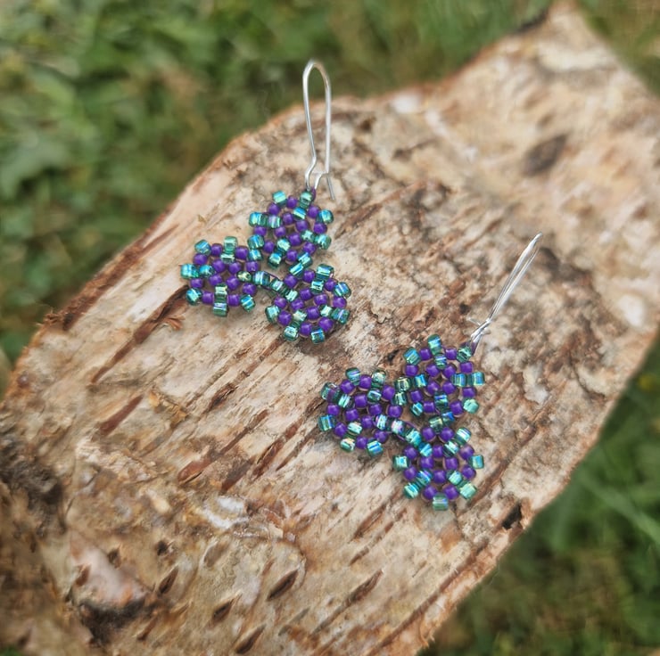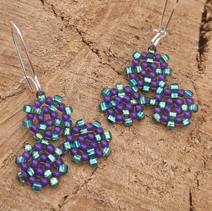 These cute beaded earrings were made with the Celtic spiral designs as influence. These are made with shimmering blue and plum purple seed beads and silver plated ear wires.